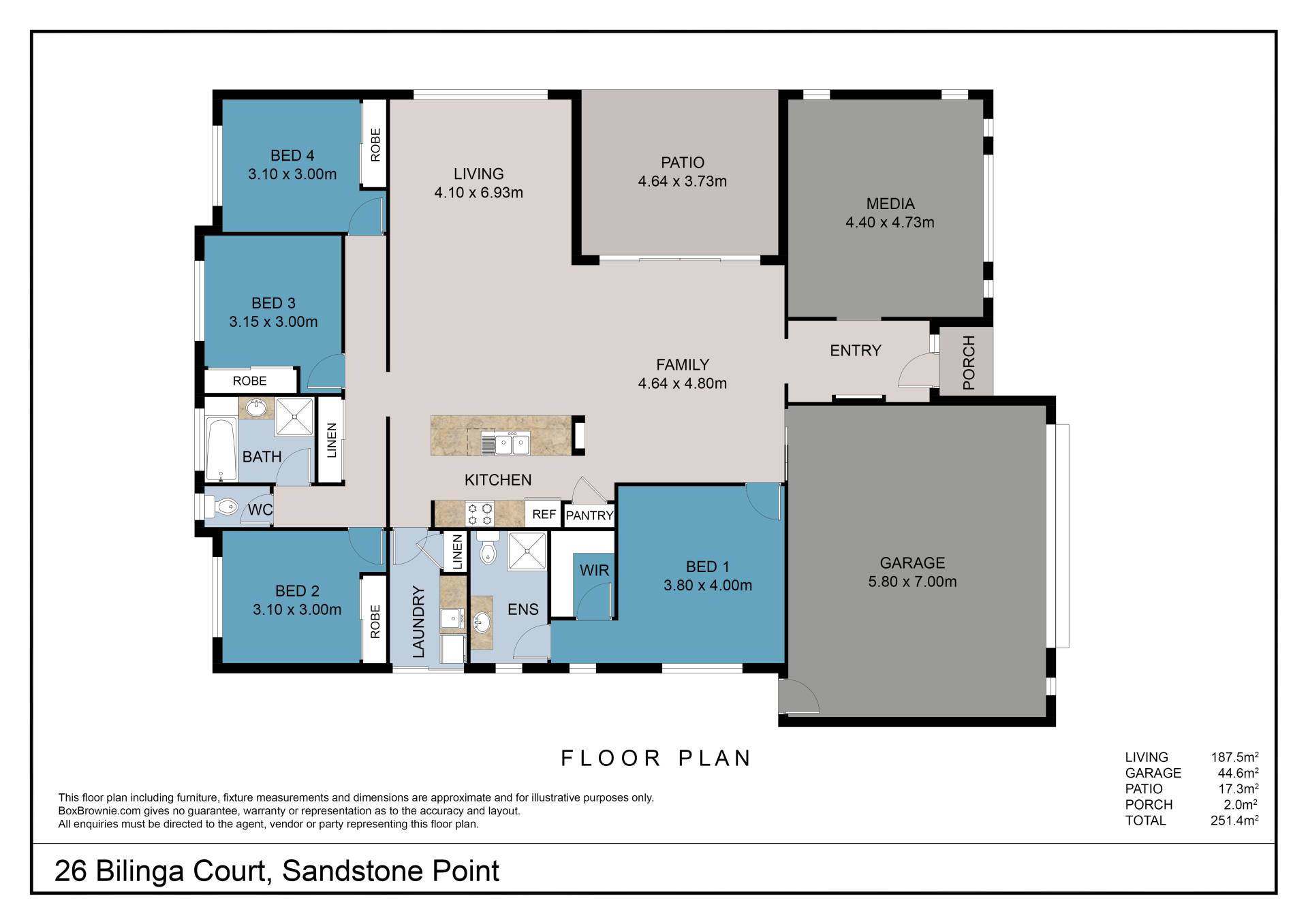 Bedrooms: 4 good sized bedrooms await you here. The master has air-conditioning, walk in robe and ensuite. The other 3 bedrooms are at the rear of the home and have ceiling fans and built in robes – two with air-conditioning.