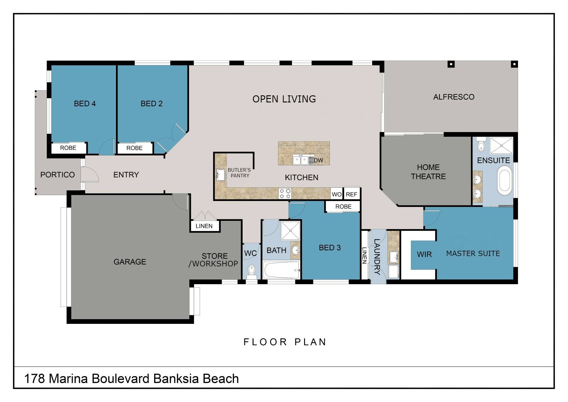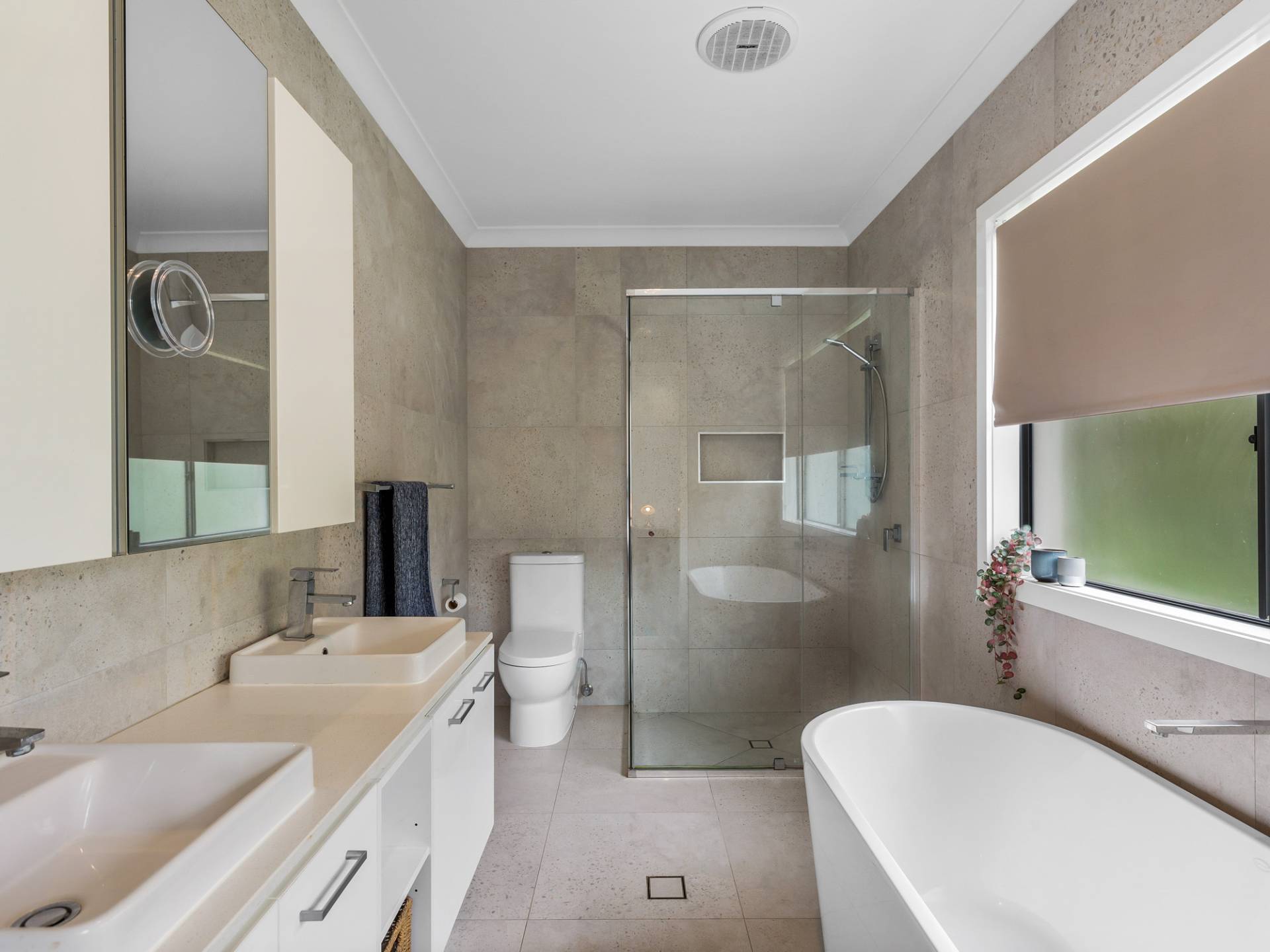 With 292m2 of coastal elegance throughout and bringing in features such as ducted air, high ceilings with designer fans and natural light, you are welcomed inside by neutral tones and a beautiful open floorplan where the kitchen, dining and lounge all flow towards the tri-fold sliding doors to the outdoor entertaining space.