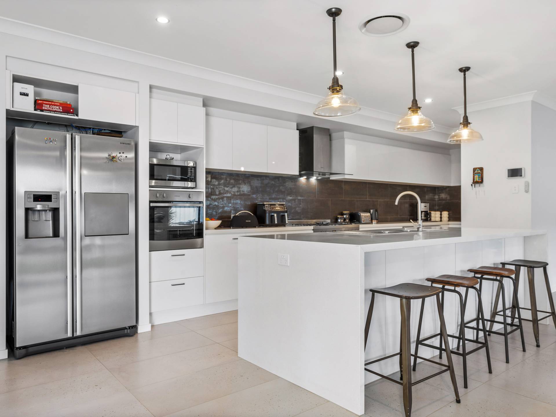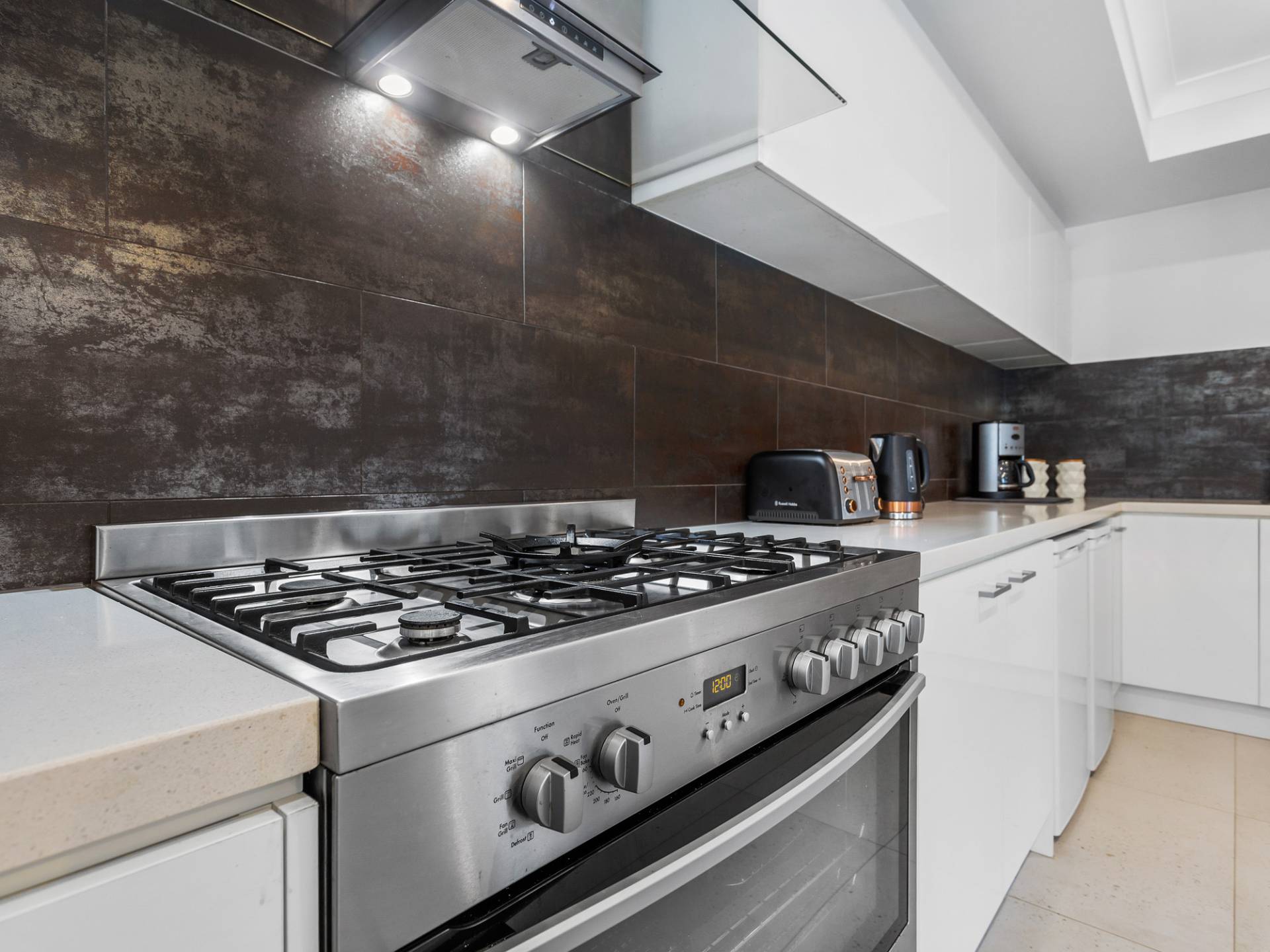 • Stone bench tops, quality appliances, double sized fridge cavity plumbed with water, 900mm freestanding 5 burner gas cooker