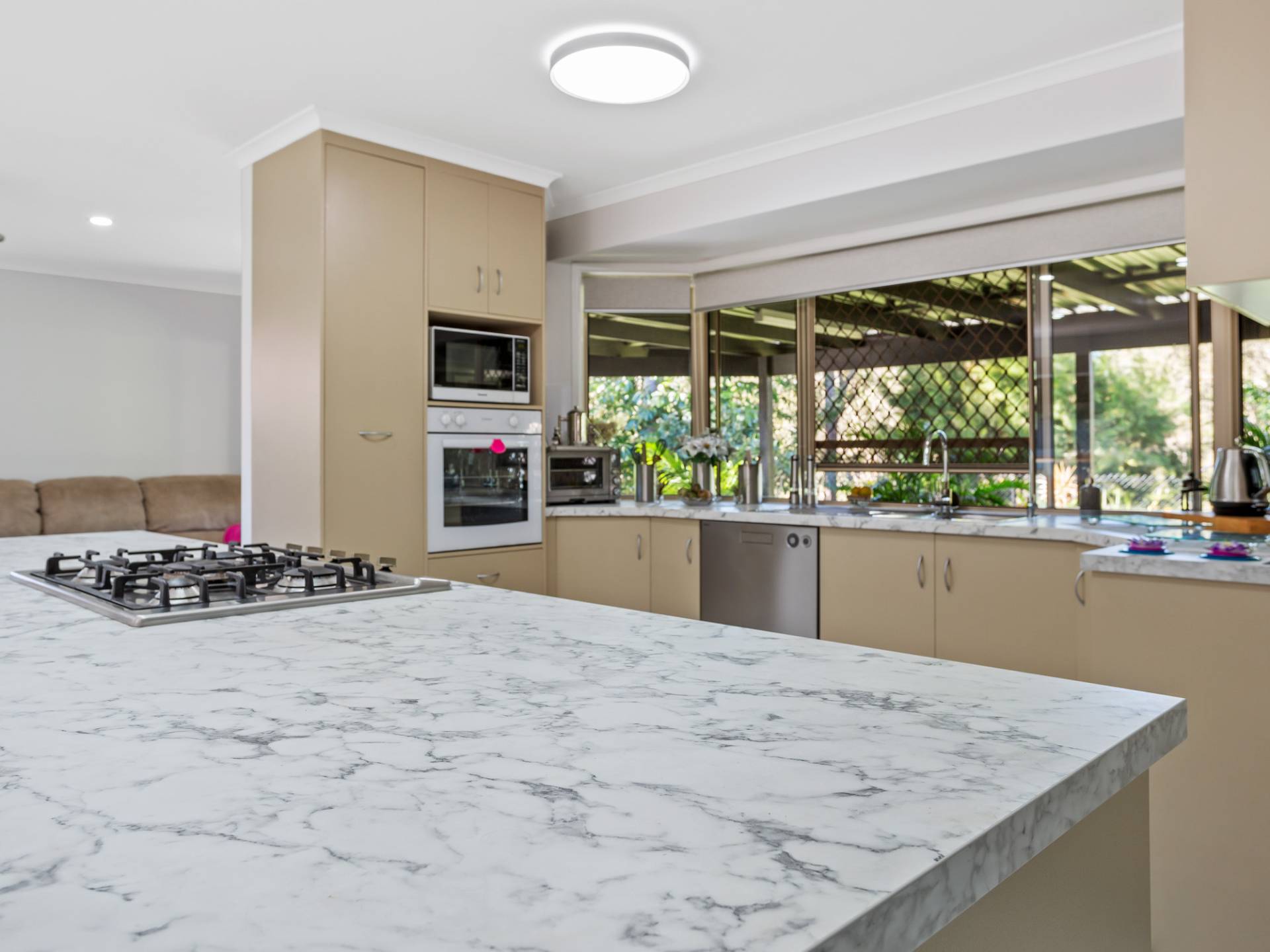 • Kitchen refreshed with new countertops and comes with near new dishwasher, wall oven, pull out pantry plus a second pantry, along with oodles of storage space - there's even a servery window from the kitchen to alfresco entertaining area