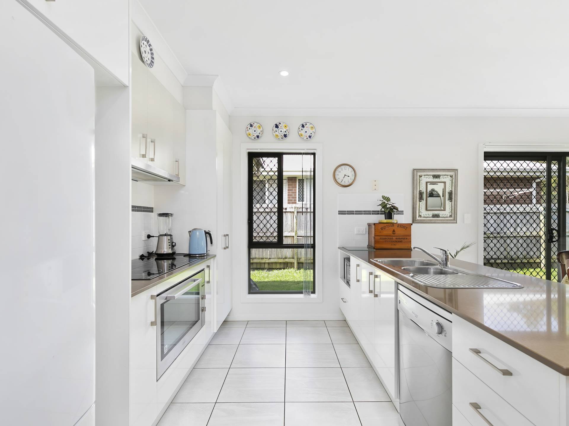 * Kitchen with stone bench tops and dishwasher, 900mm electric oven and cook top