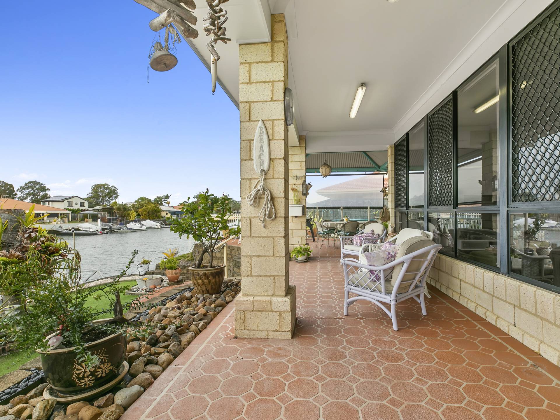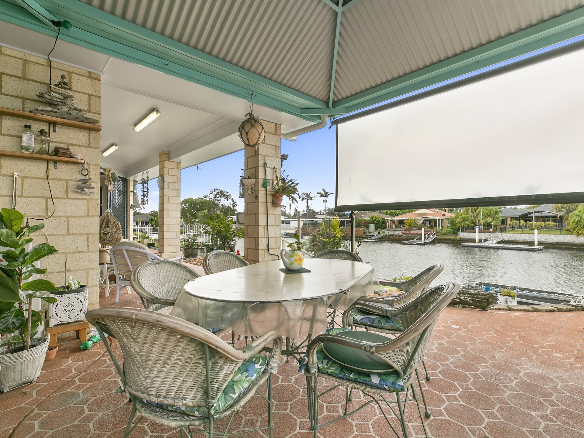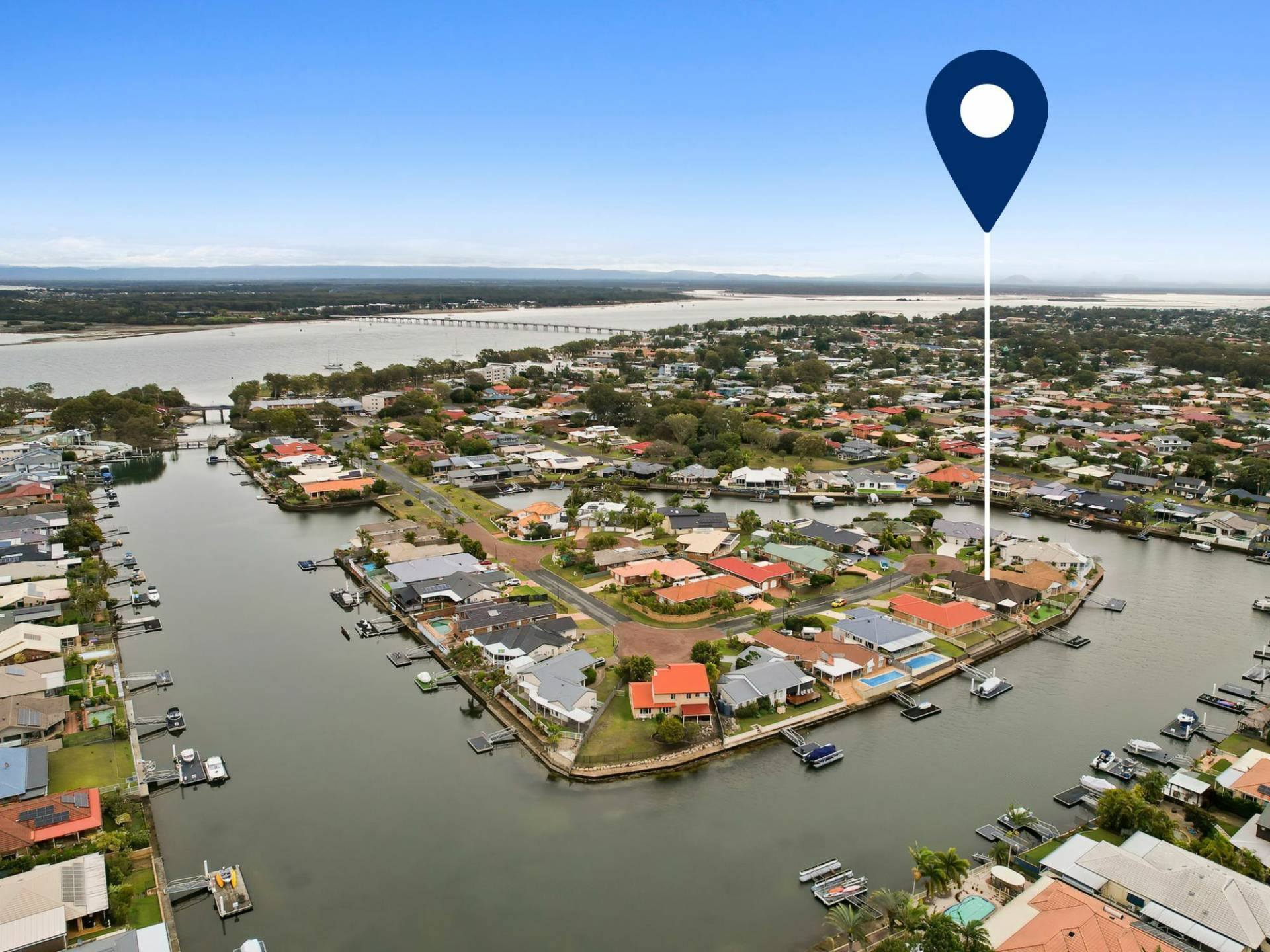 Outdoor entertainment area Water frontage Water access Safety Switch Garage Remote Air Conditioning Solar Power Pontoon Balcony Deck Verandah Terrace/Paved Courtyard Undercover outdoor area Jetty Fenced Low maintenance Outside Spa Level Block Close to school Garden Shed Two Living Spaces Open Plan Living Canal Views Close to shops Plantation Shutters Water Views 5000L water tank Built-in wardrobe Air conditioning Dishwasher