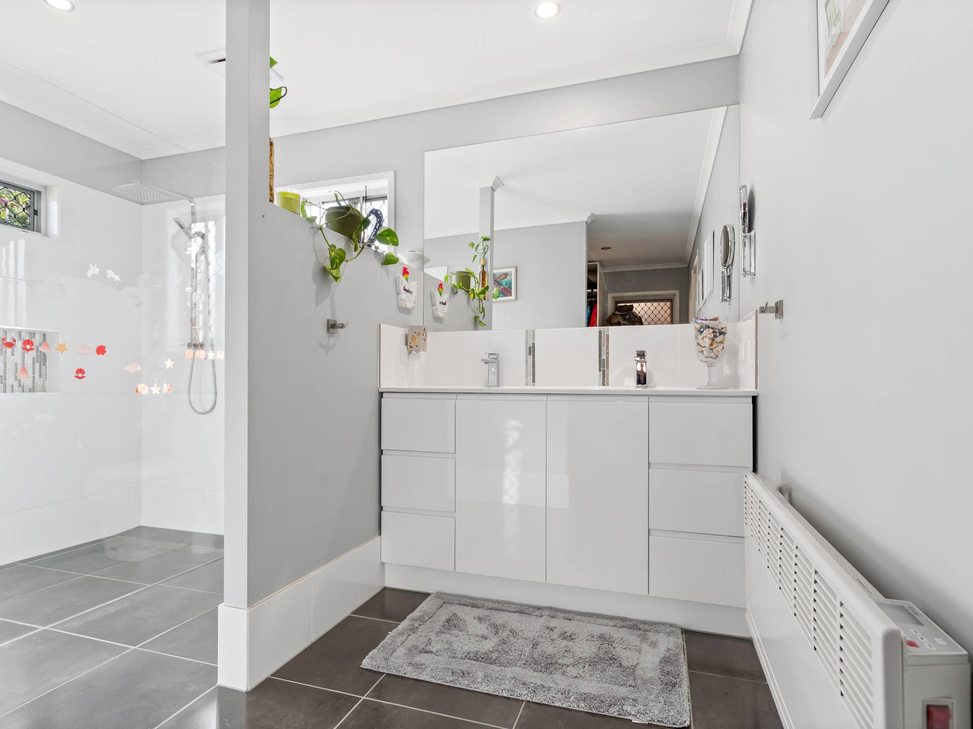 Three bedrooms are located in the house, with the fourth, the perfect guest retreat, located off the outdoor entertaining space. The master suite offers a large walk-in-robe and beautifully appointed ensuite with double basins, a huge shower, modern toilet suite and a wall mounted heating system for the colder months.  The master suite has both ceiling fan and air-conditioning and more clothes storage with a double mirrored robe.