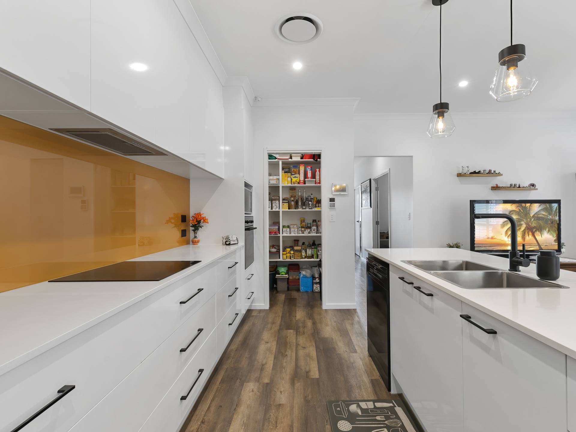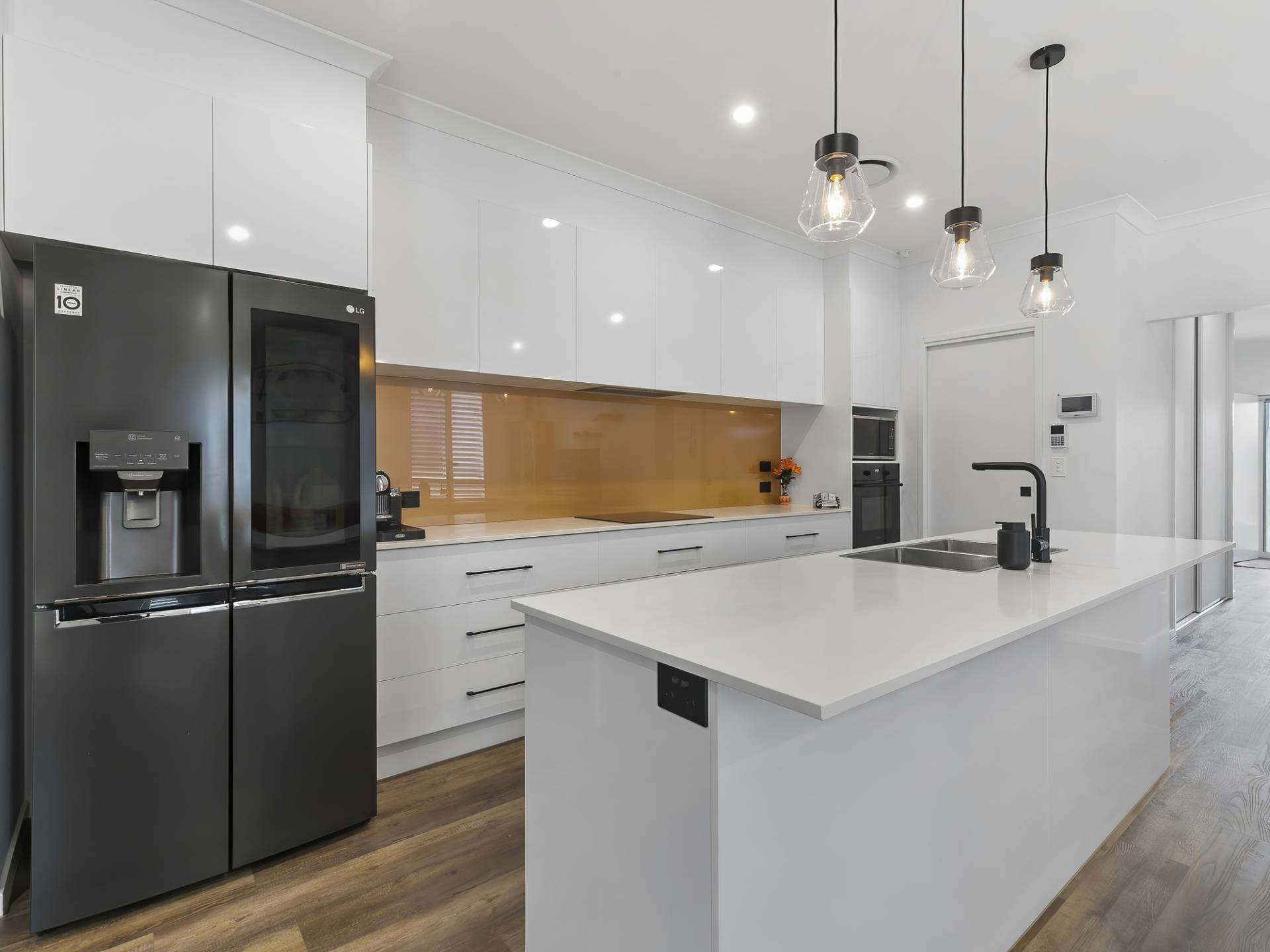 • Impressive kitchen with stone benchtops, walk-in pantry, soft close cabinetry, plumbed in fridge cavity, feature glass splashback, Smeg dishwasher, Italian quality ILVE induction cooktop and oven, double sink and feature pendants