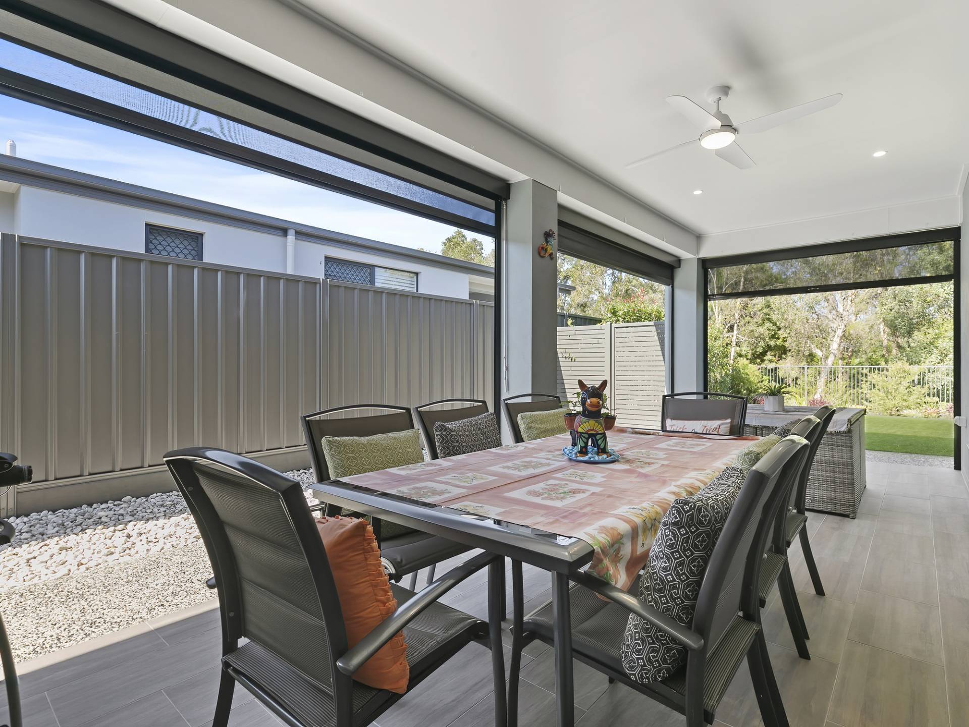 • Good sized North-Easterly aspect outdoor entertaining area with ceiling fan and power. Shade blinds installed to enclose the alfresco for maximum privacy and protection from the elements