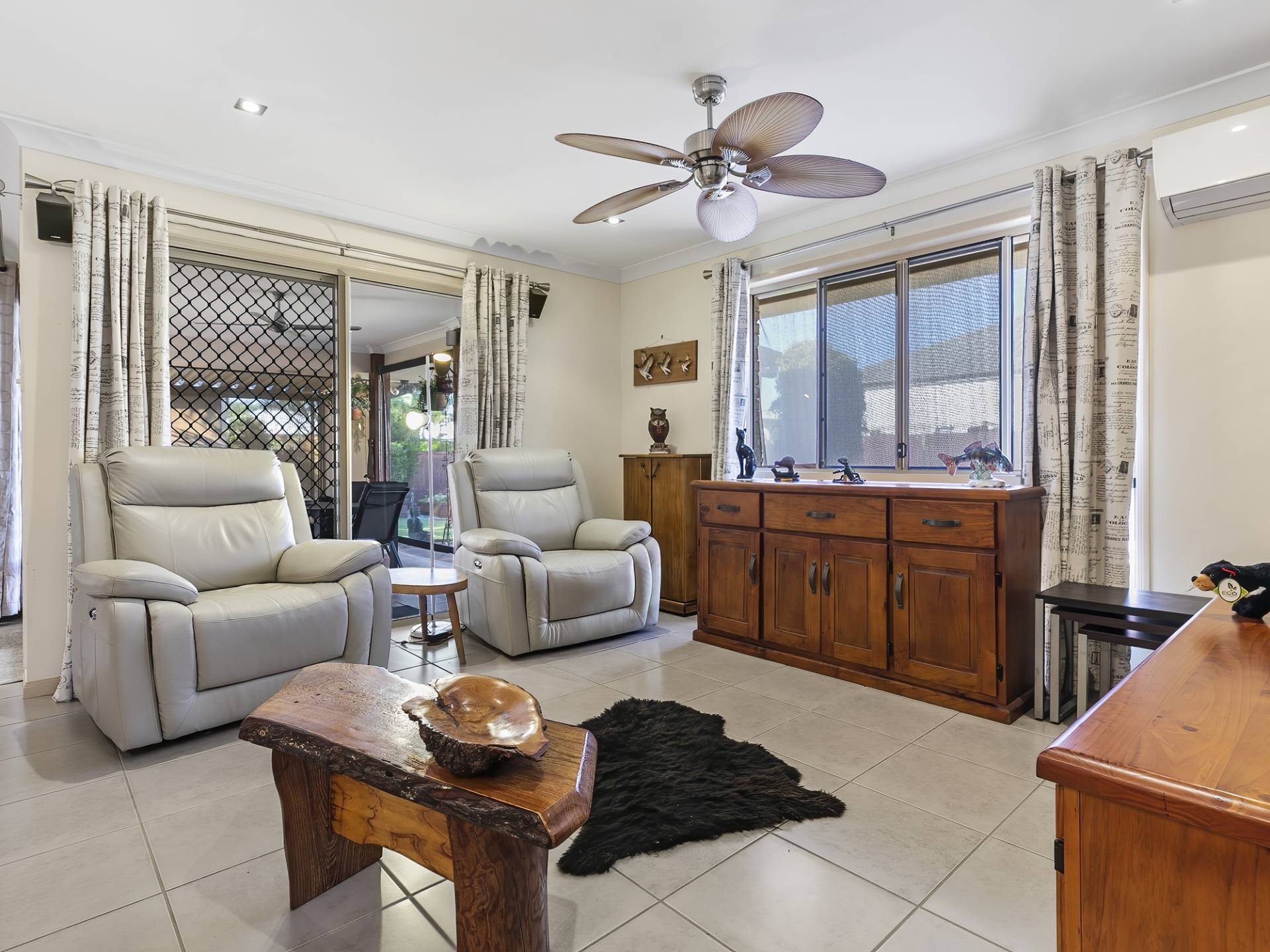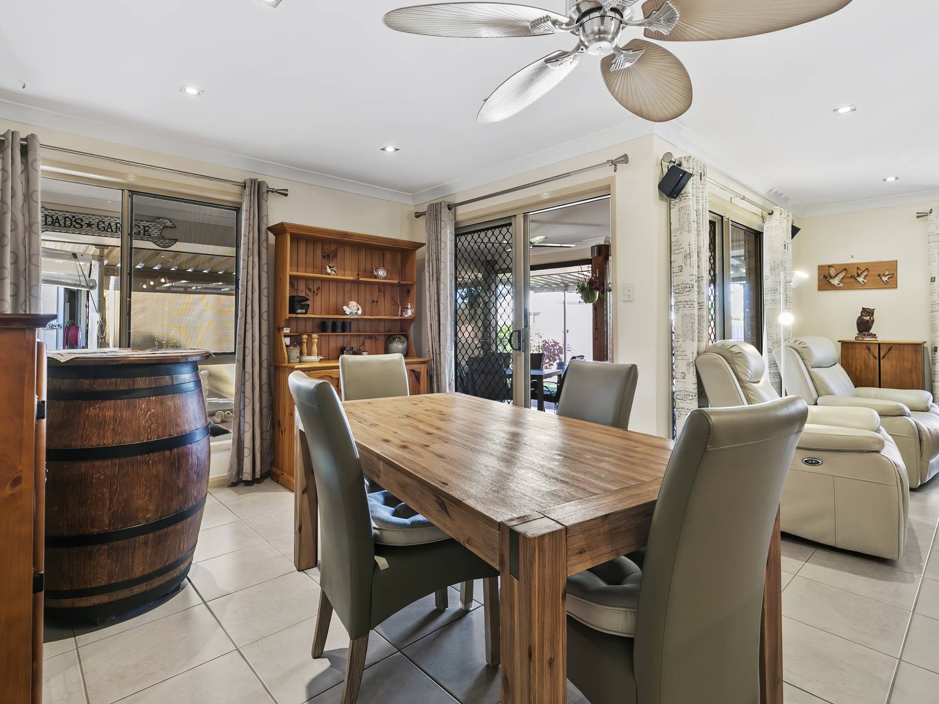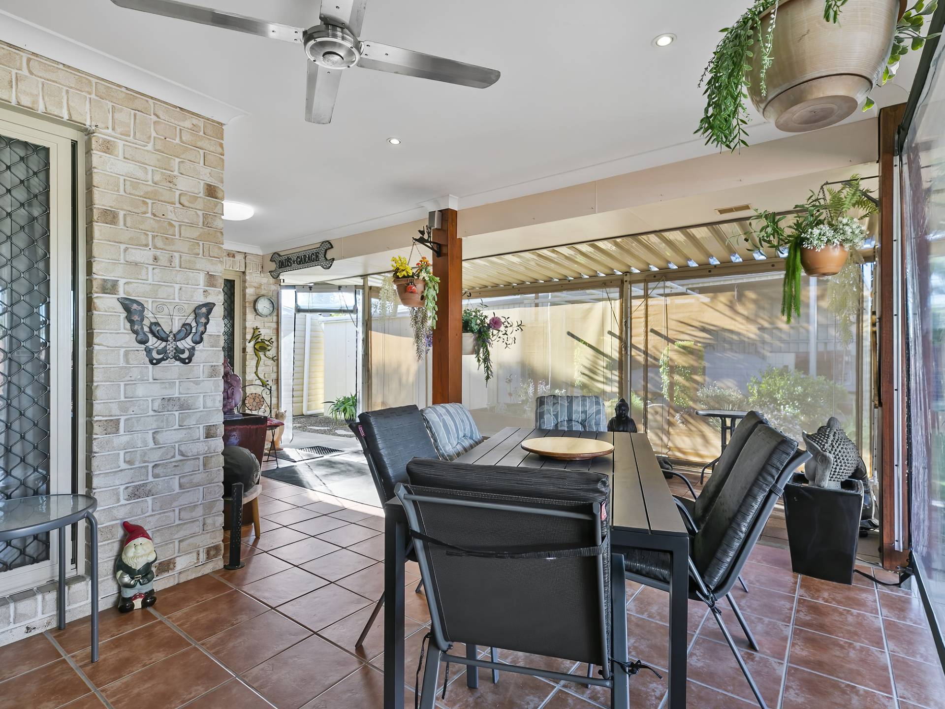 • Large tiled outdoor entertaining area fully screened with ceiling fan and feature tallow wood posts