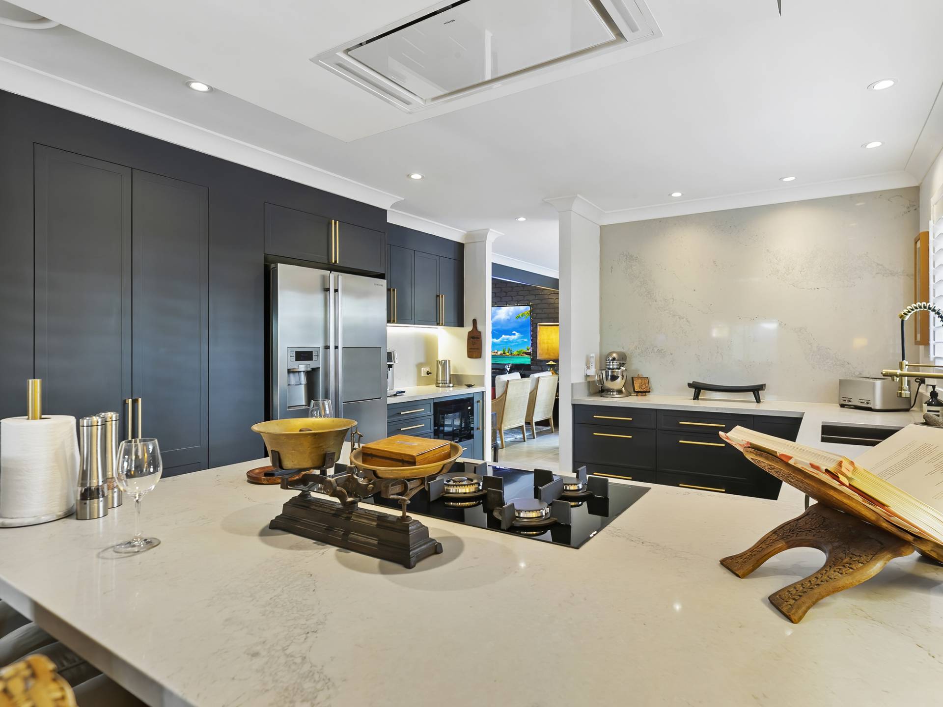 • Kinsman Block 2021 winner Cabinetry in Montauk Ink with brushed brass handles, LED strip under light, Noble Grey CaesarStone top and splashback
