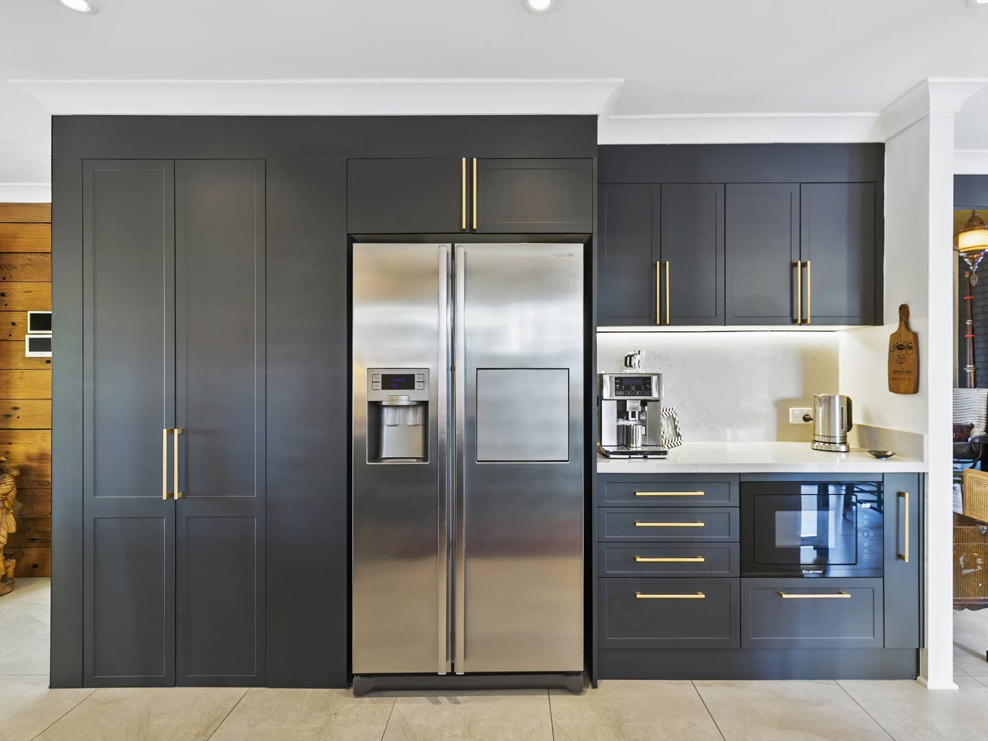 • Laundry with new cabinetry, brushed brass handles, LED strip under light, black granite sink, brushed brass tap and Noble Grey CaesarStone top and splashback