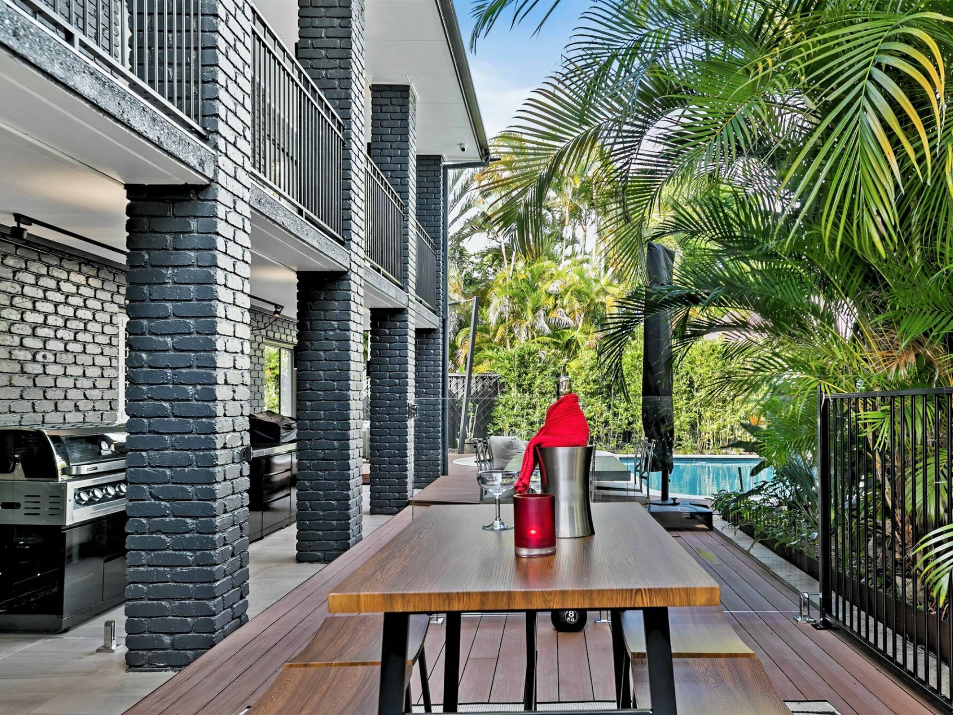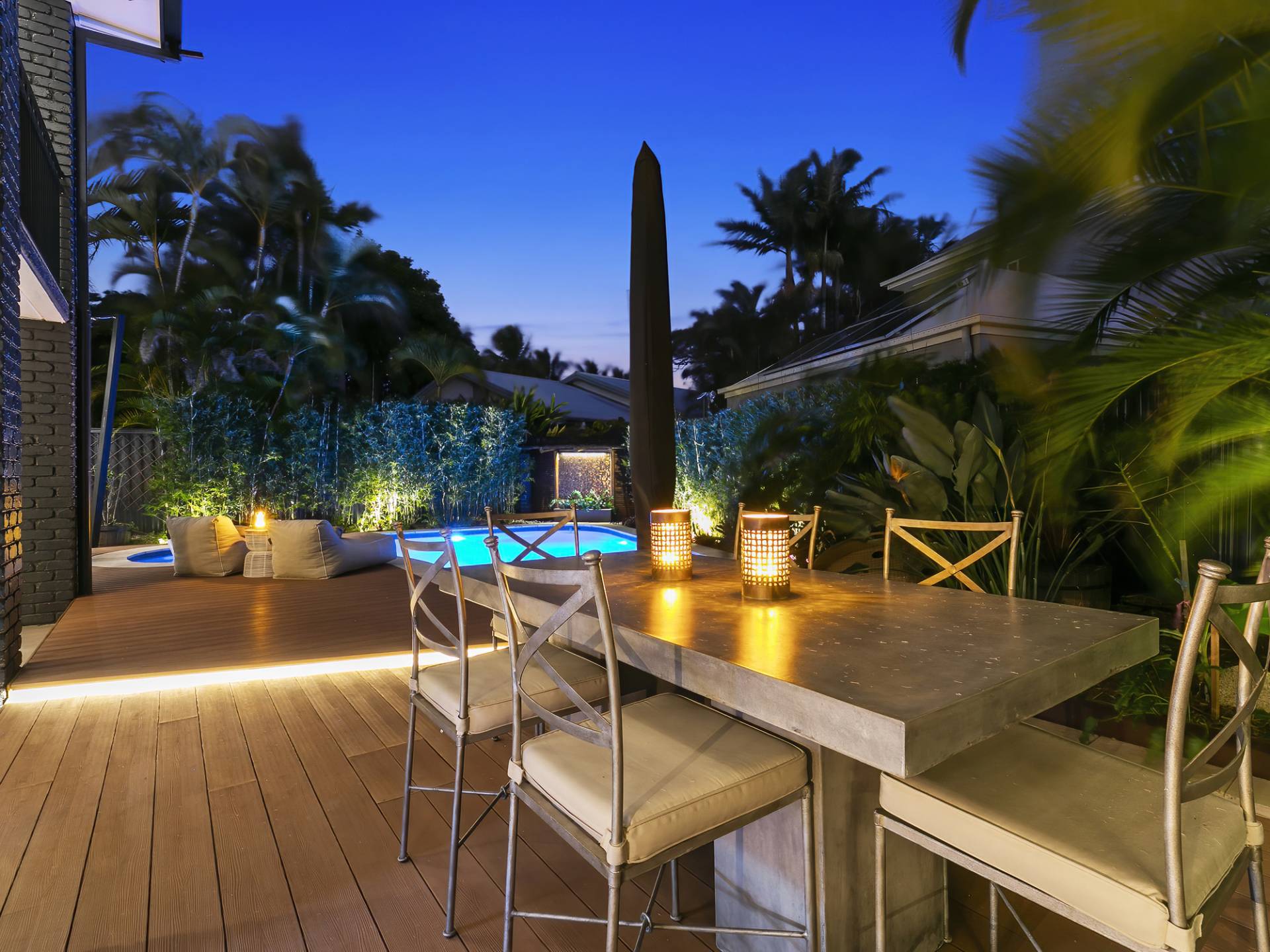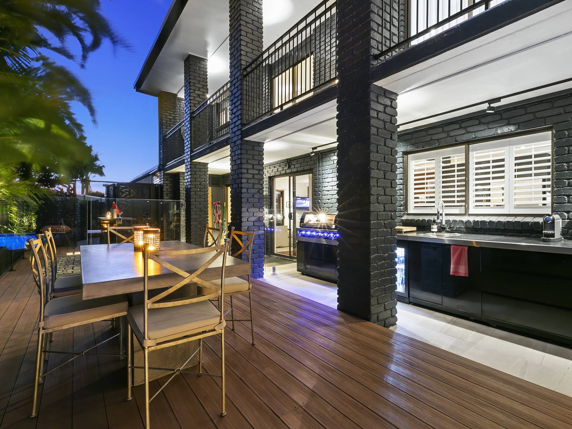 • Full outdoor kitchen and BBQ with above focused dimmable track lighting