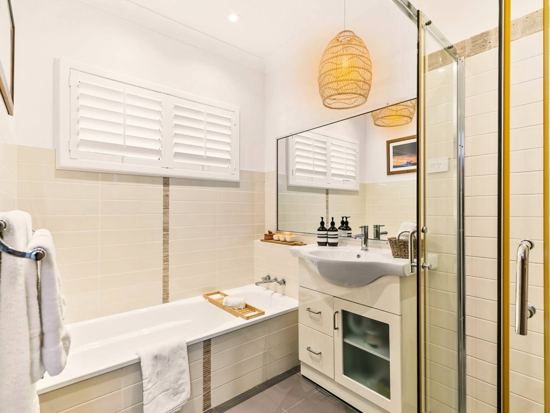 • Master suite bathroom with honed Ivory Travertine stone flooring throughout, honed Ivory Travertine stone on select walls, separate toilet with Roca smart rimless toilet and commercial silent air extractor, floor to ceiling glass shower screen with twin shower heads and stone wall, shower niche with LED with commercial silent air extractor, free standing 1700mm bath with floor mounted tap mixer, two curved oak vanities with Carrara stone tops and brushed gold handles and matt white round sinks, two Copper art round bevelled mirrors, two art-deco vanity pendants, heated towel rail