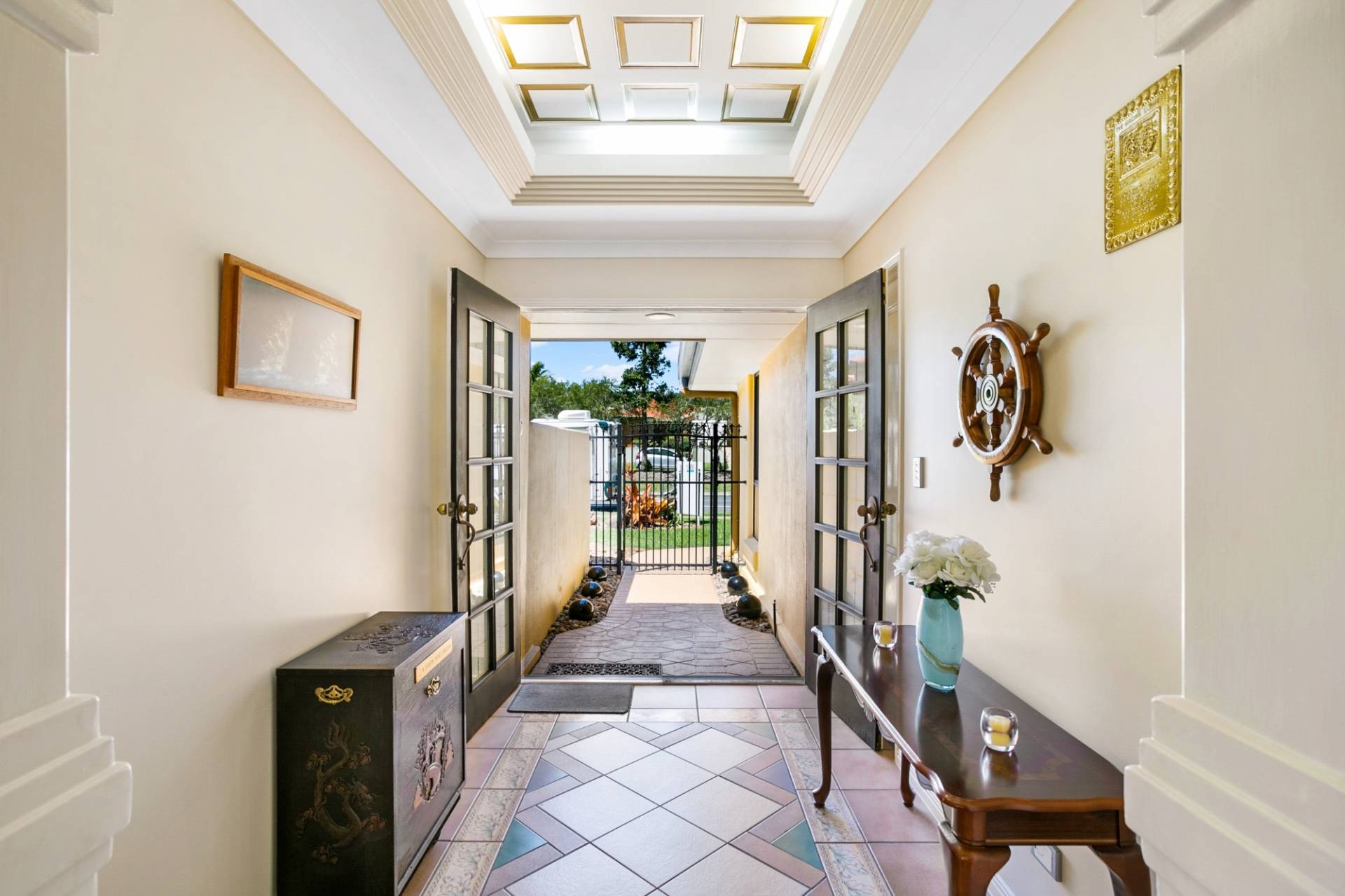 A wide-open waterway as your backdrop and a generous floor plan, you’ll be hard pressed to find another that ticks as many boxes.  From the point of walking through the double feature front doors, you will be met by an entry inspired by art deco ceiling features and mood lighting. A generous media room offers the first of two living spaces.