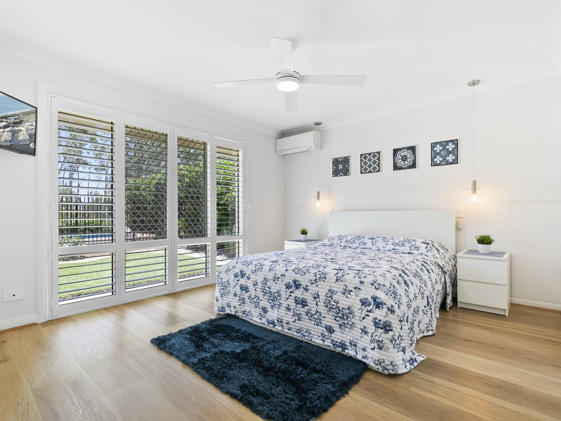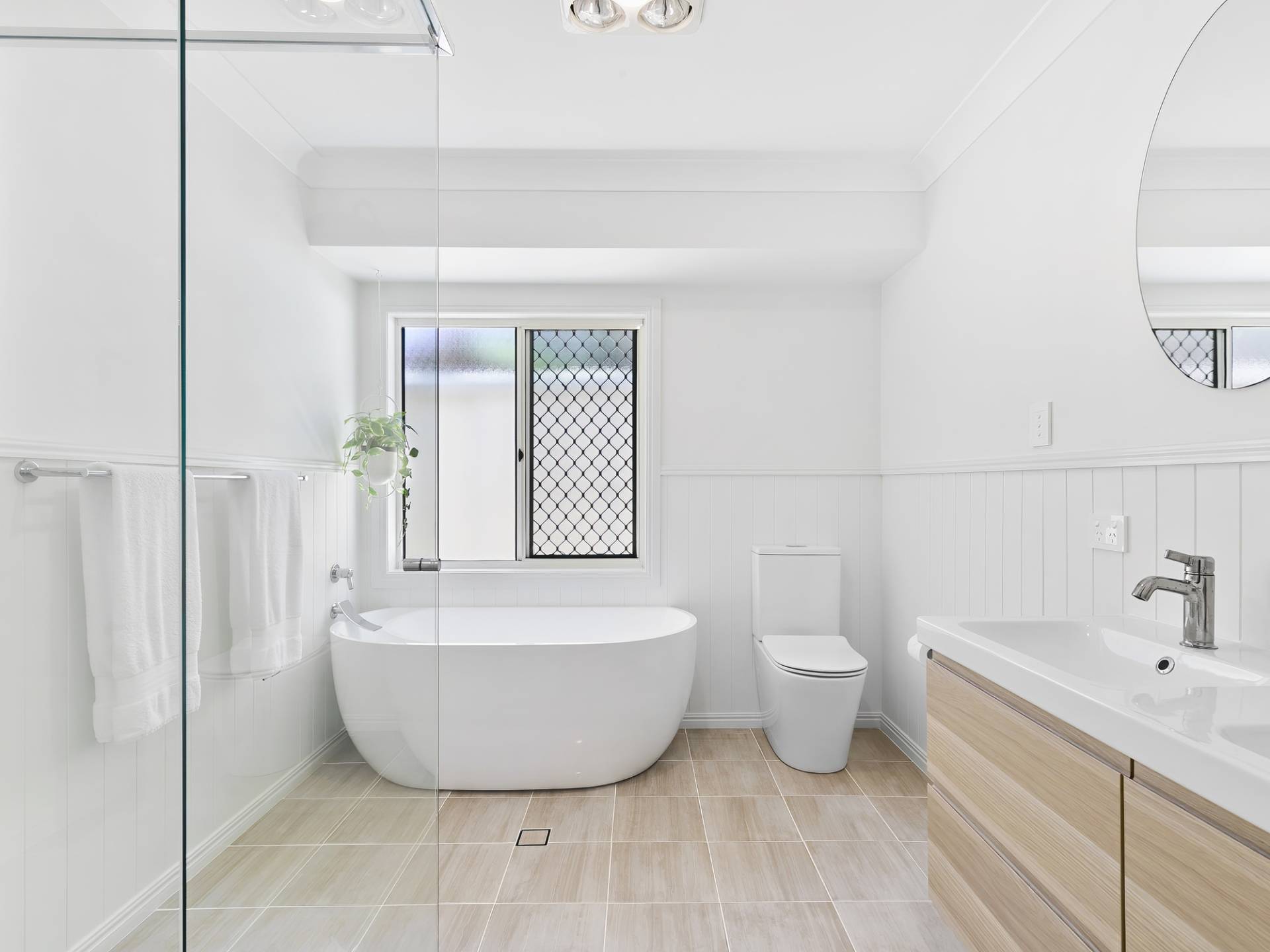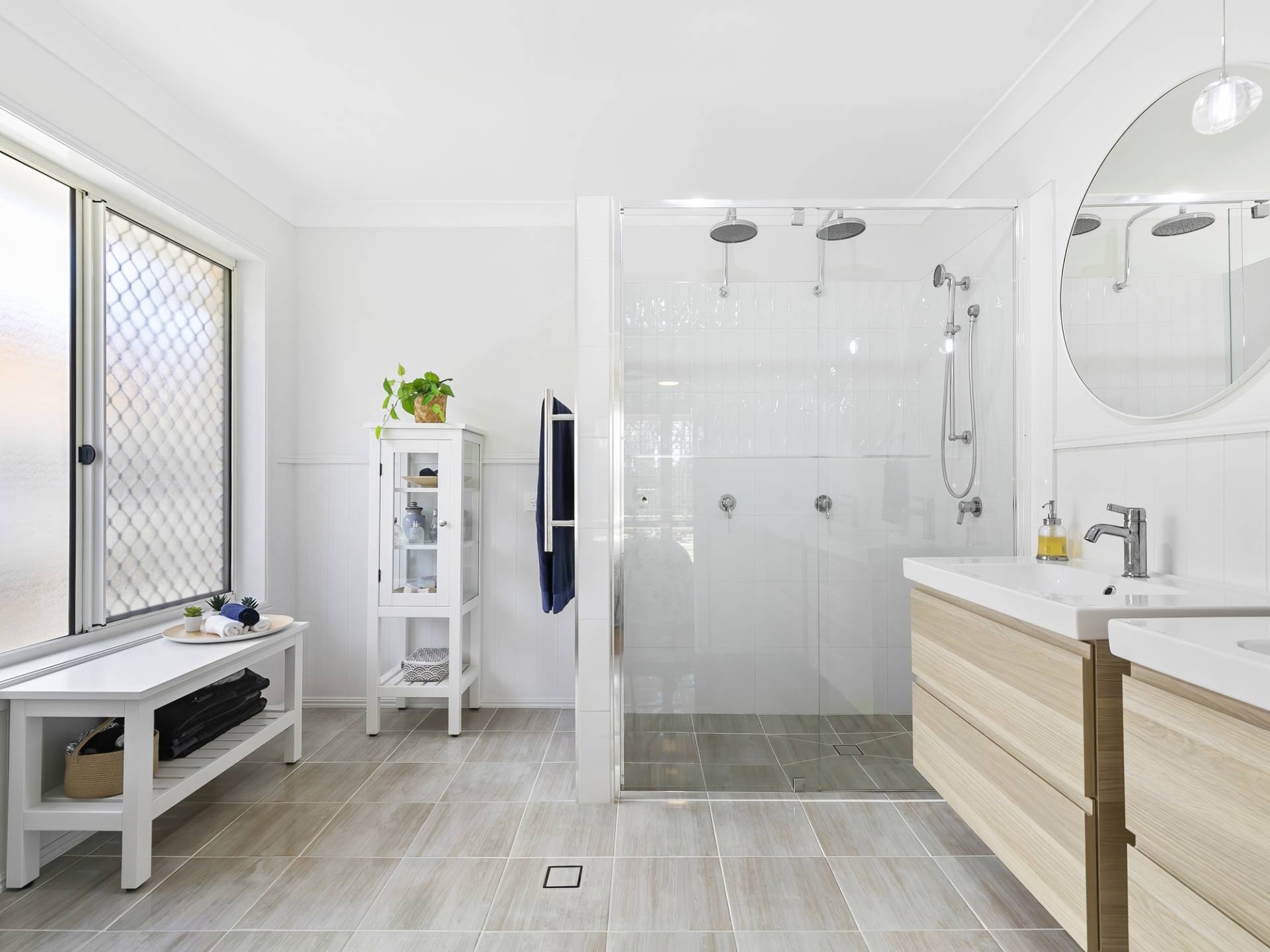 Sleeping quarters consist of three beautifully appointed bedrooms downstairs. The air-conditioned Master Suite is a relaxing haven with two walk in wardrobes and a beautifully appointed ensuite bathroom featuring double shower heads and double vanity.  The other two bedrooms (one with air-conditioning, both with ceiling fans and BIRs) share the main bathroom featuring double vanity and a freestanding bath tub, perfect for an indulging soak!