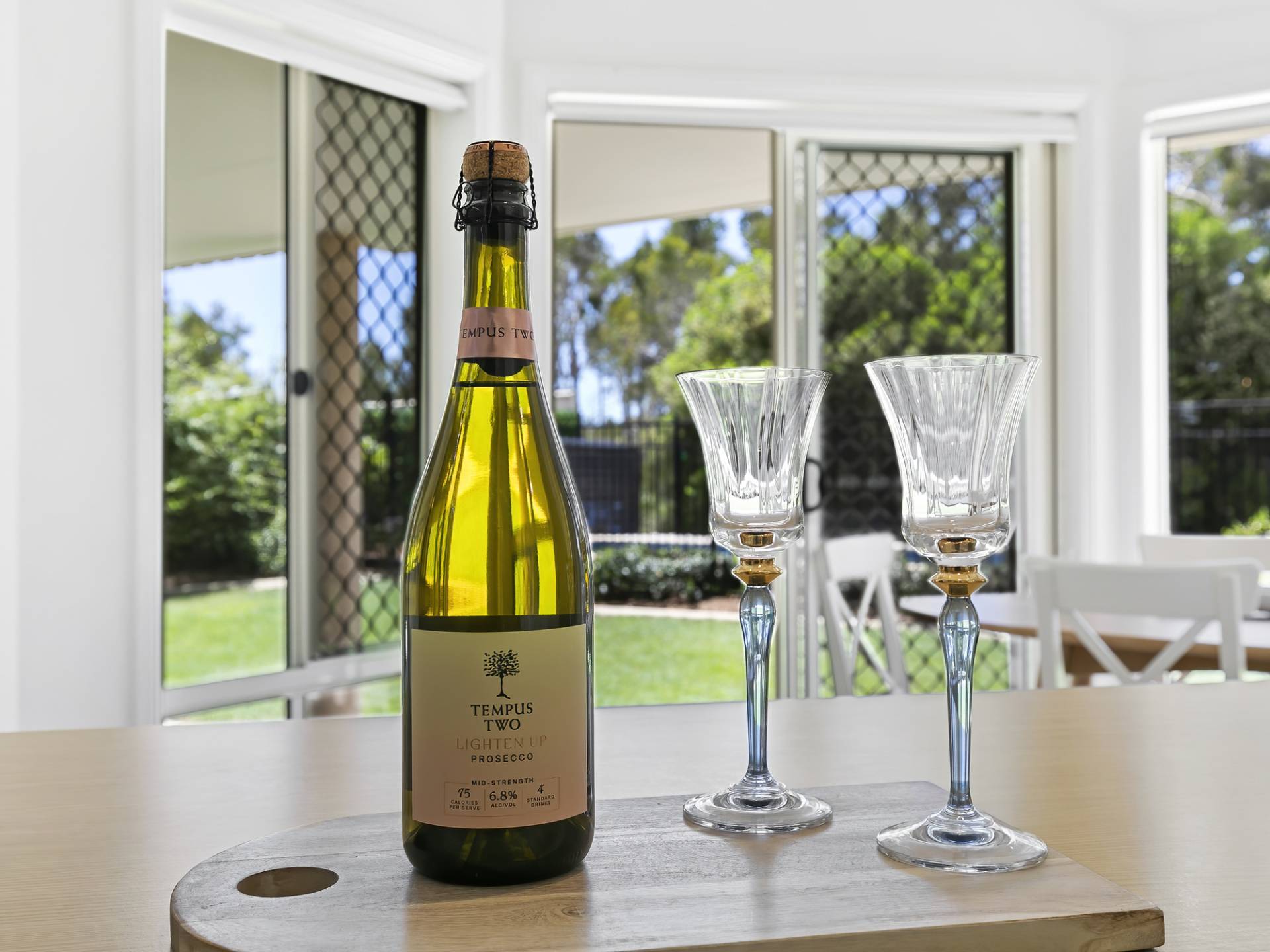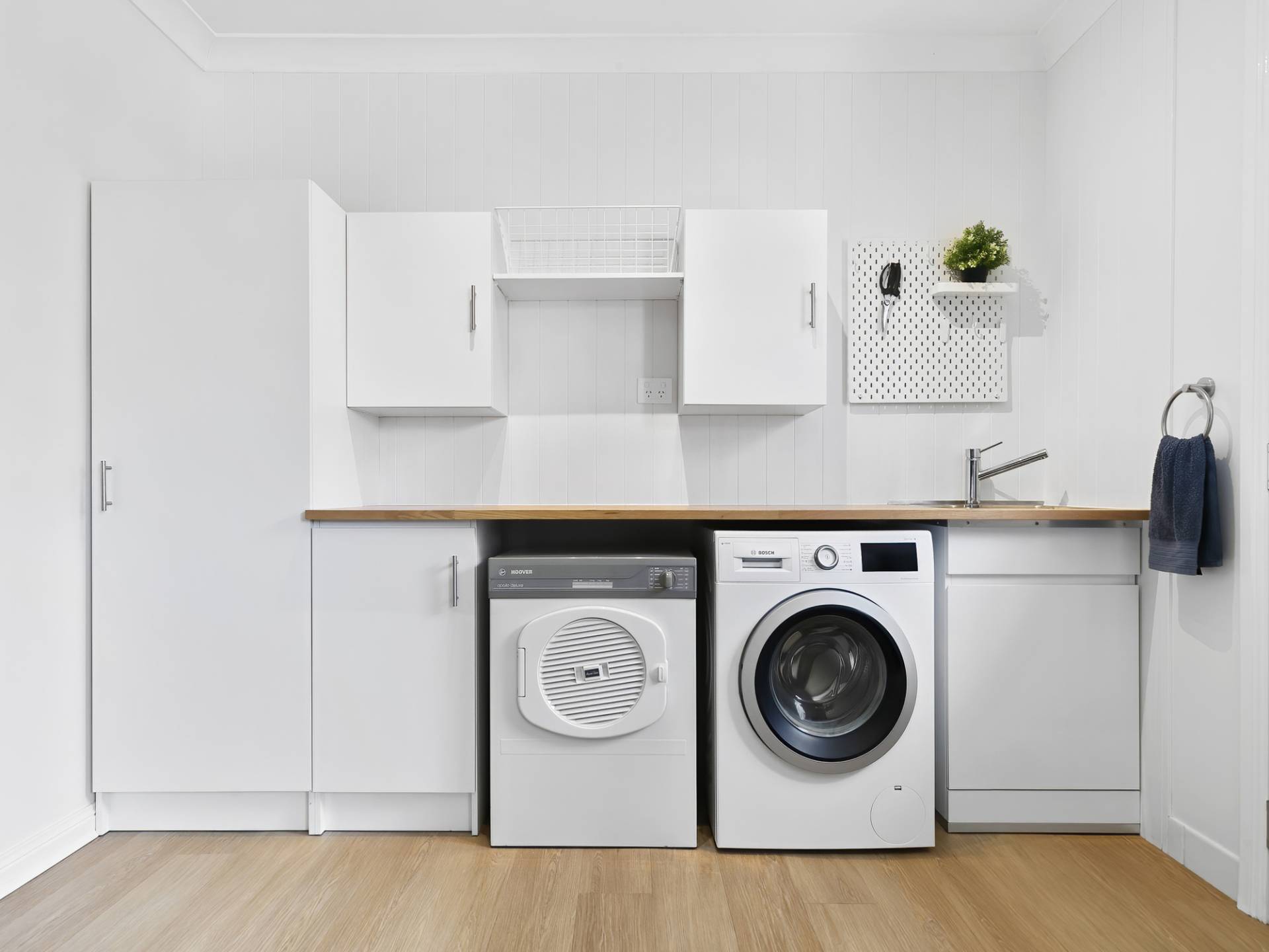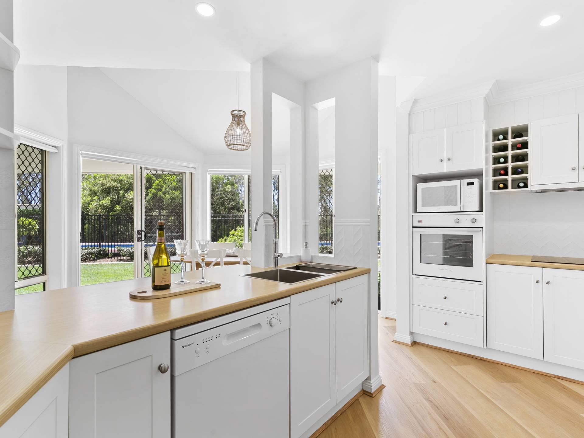 The kitchen provides a good workflow and storage solutions, featuring designer tiling, built-in-oven, dishwasher, Walk In Pantry, wine rack and plenty of bench space, complemented by a crisp white pallet and timber finishes.