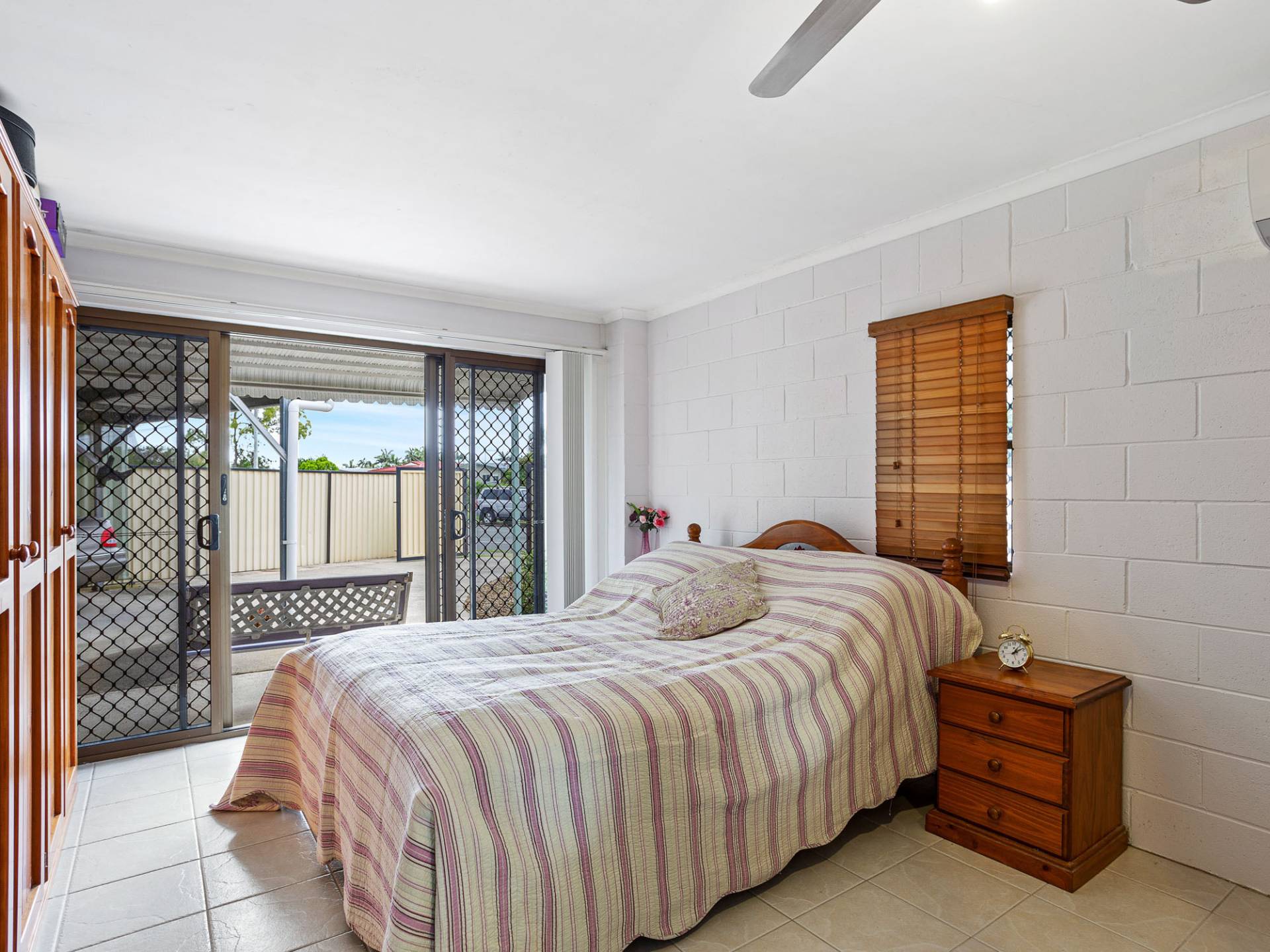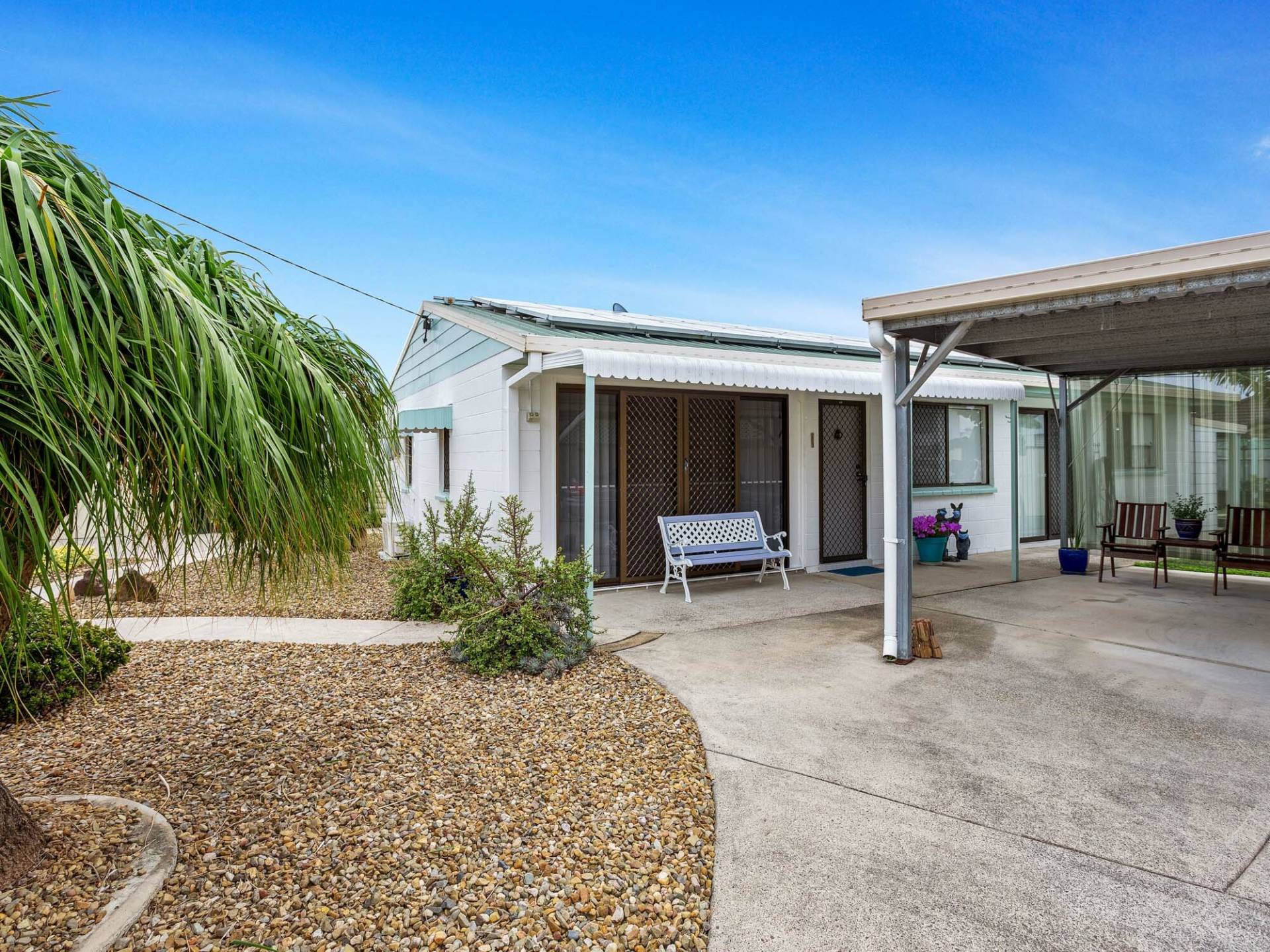 The main bedroom is air-conditioned and has a wide sliding door that opens to a covered patio area.  Bedrooms two and three are air-conditioned with ceiling fans. All bedrooms have robes and security screens.  The house is brimming with potential and, with some clever revamping, an ensuite could easily be added to the main bedroom due to the extra large laundry space. Alternatively, leave as is and use the space that the laundry provides for a small workshop or home office.