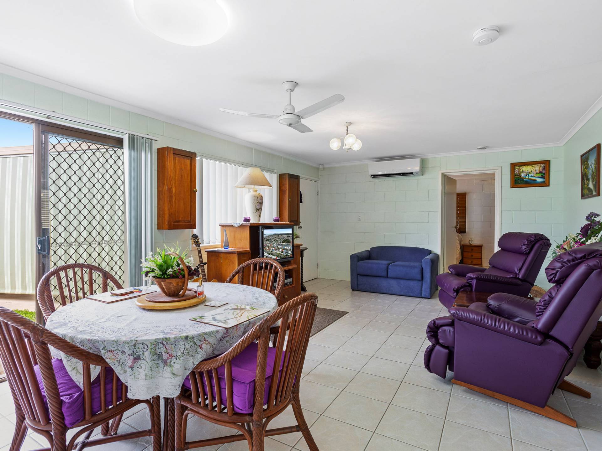 The open plan kitchen, dining and living areas enjoy air-conditioning, ceiling fans and sliding doors for natural ventilation and light flow.