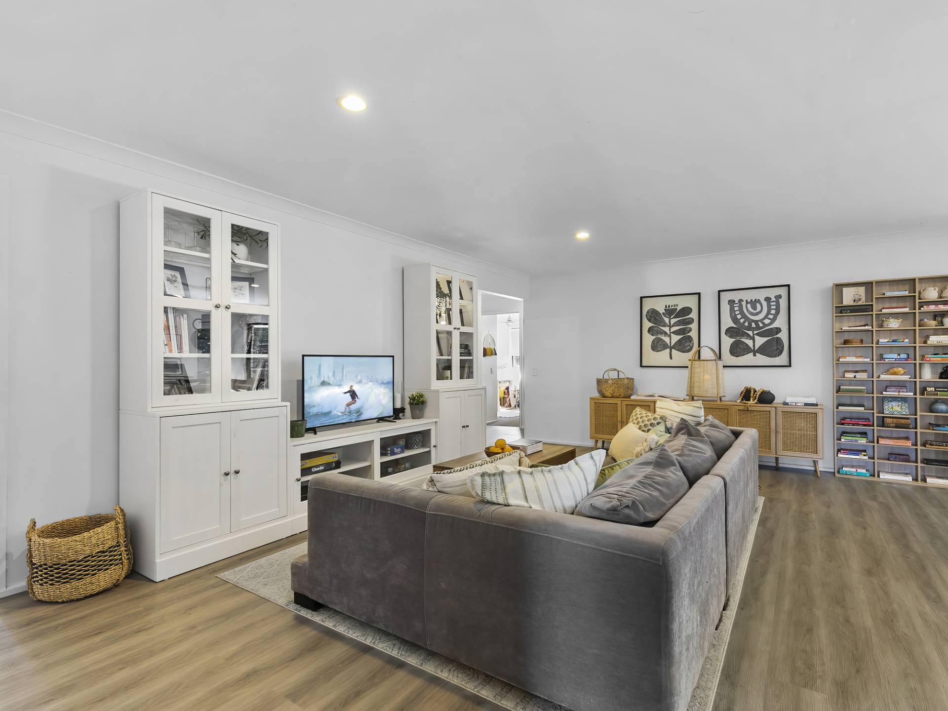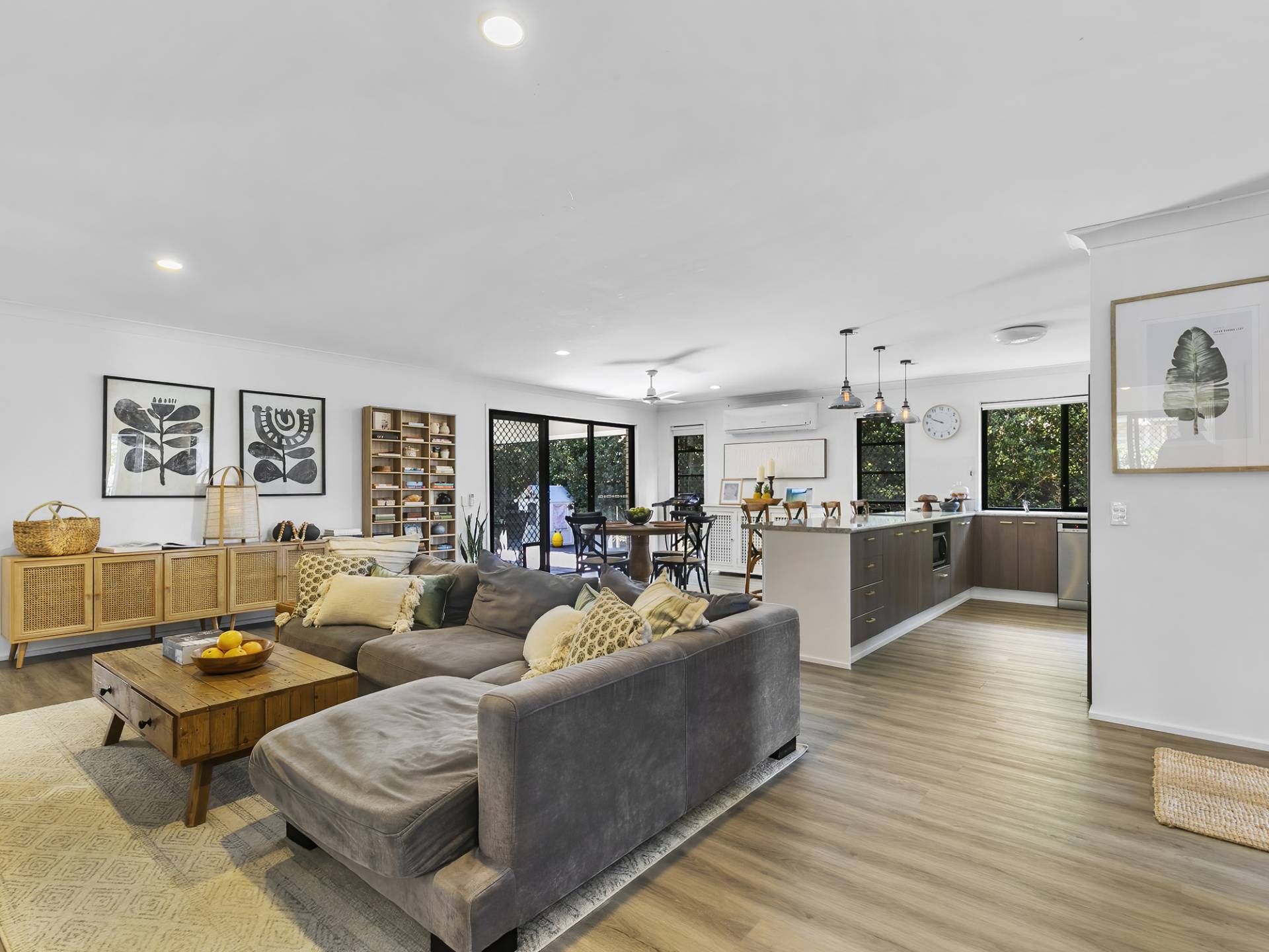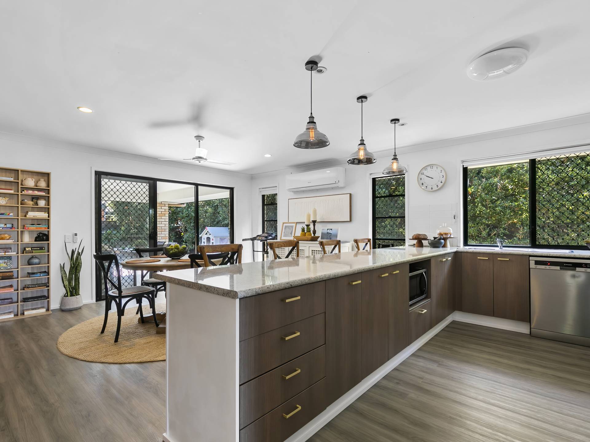 The well-appointed kitchen sits in the heart of the home offering a long preparation benchtop with breakfast bar, near new induction cook top, oven, dishwasher and great storage via overhead and under bench cabinetry.
