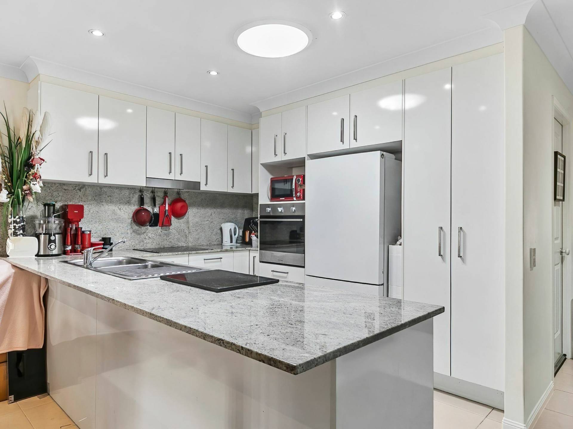 The spacious modern kitchen has granite stone bench tops and splash backs, plenty of drawers and cupboards for storage, a wall oven and glass cook top.