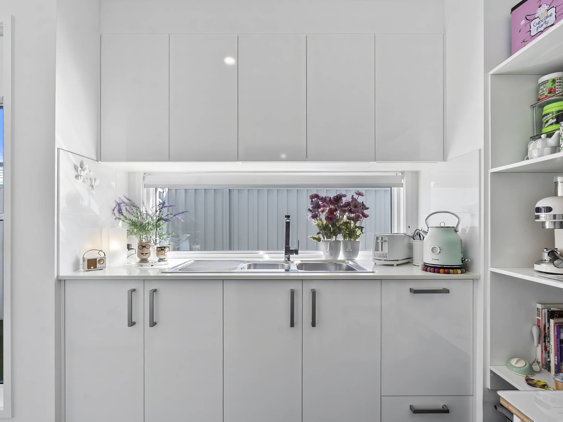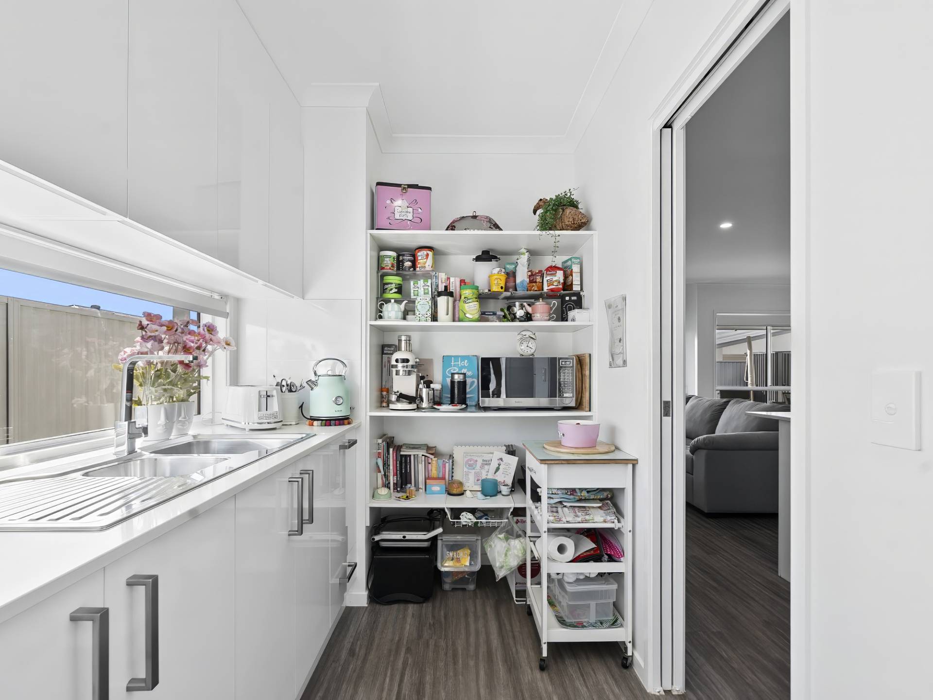 The Kitchen is beautifully appointed with stone bench tops, double sink, electric appliances, large soft-closing drawers, overhead cabinetry, dishwasher and leads directly to a fully equipped scullery where the large fridge nook is tucked away from sight, providing more room to cook, clean, and organise your kitchen items efficiently. A feature fixed window allows natural light in whilst overheads and shelving provide great additional storage.