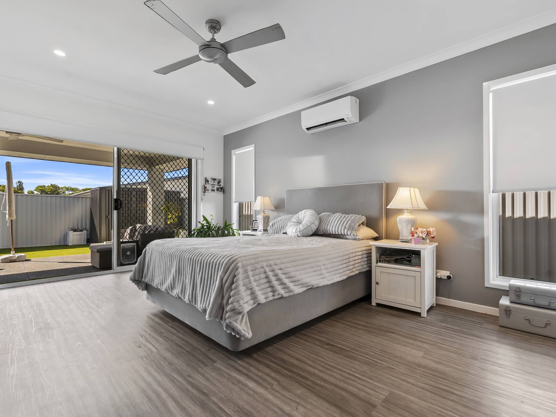 The Master Suite is King-Plus sized with air-conditioning, ceiling fan, sliding door to the Alfresco and a large walk-thru robe with shelving leading to the ensuite that is appointed with double sinks, combination shower head, toilet and a feature oversized mirror.