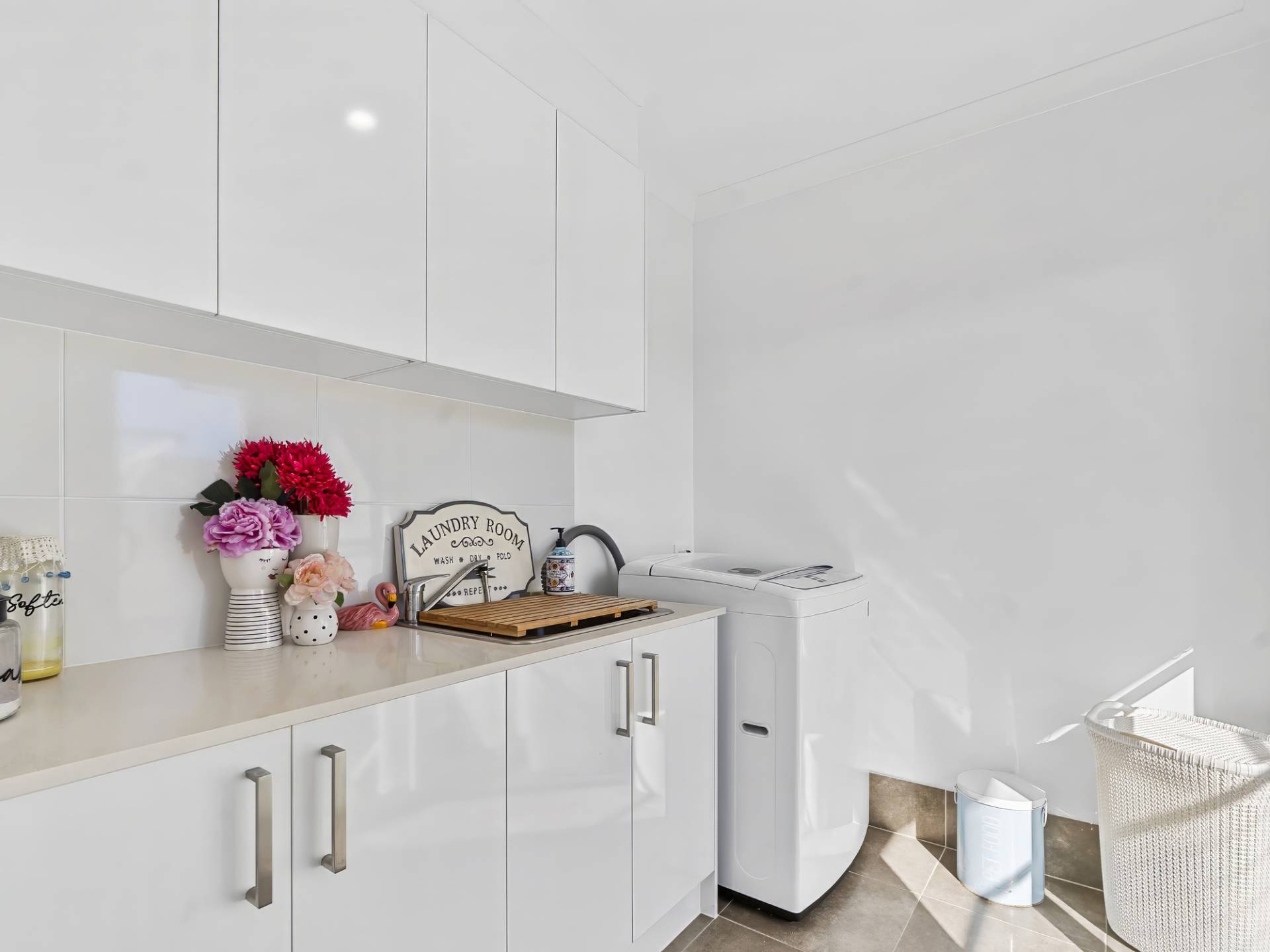 • Laundry with stone bench tops, overhead cabinetry, and easy direct access to the outdoor clothes handing area