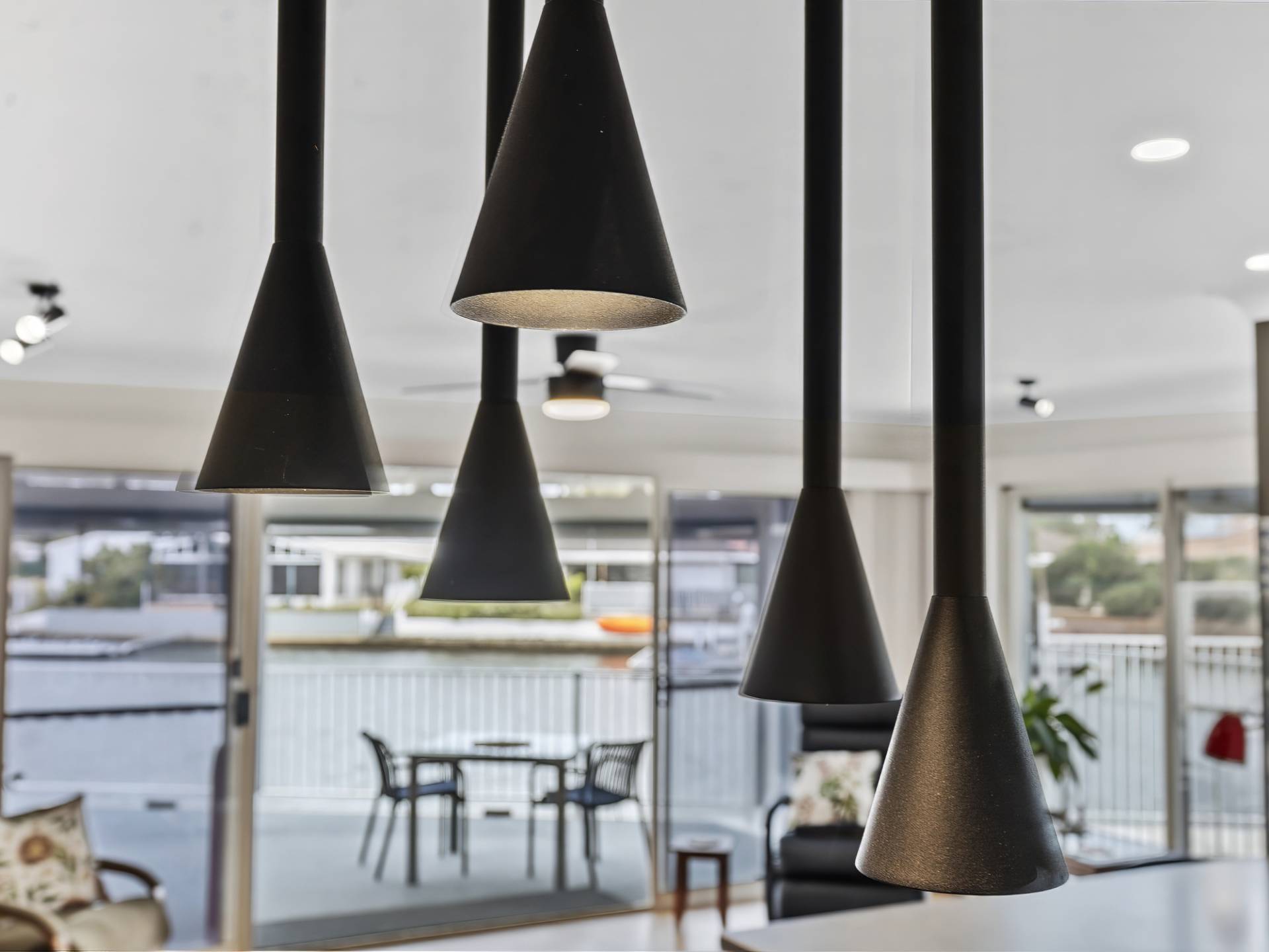 • Dining room with feature pendant lighting