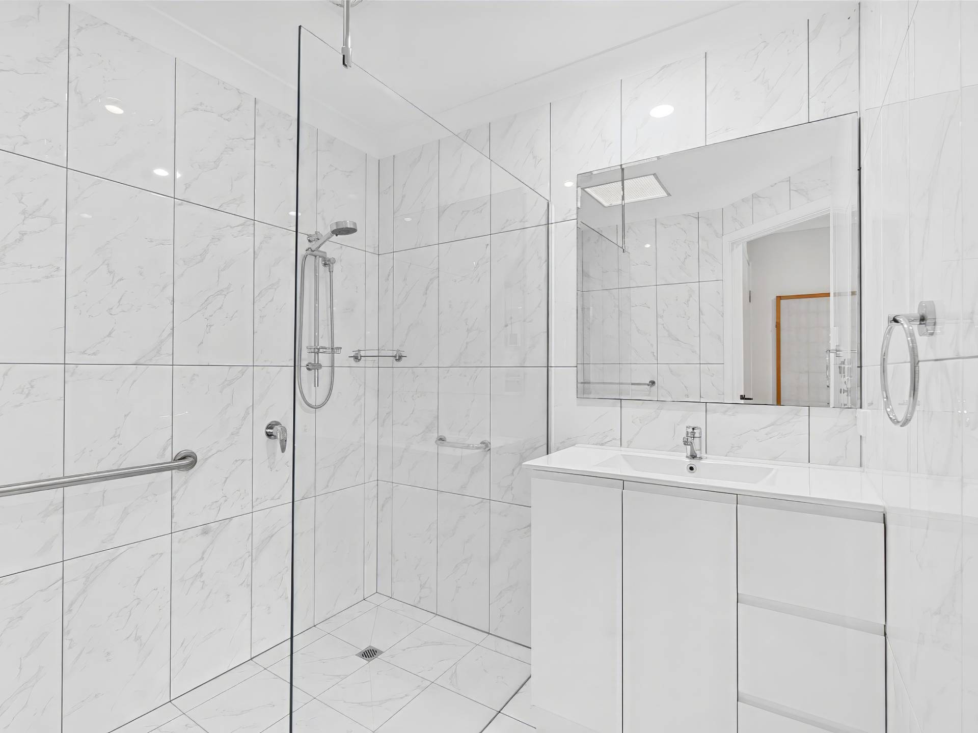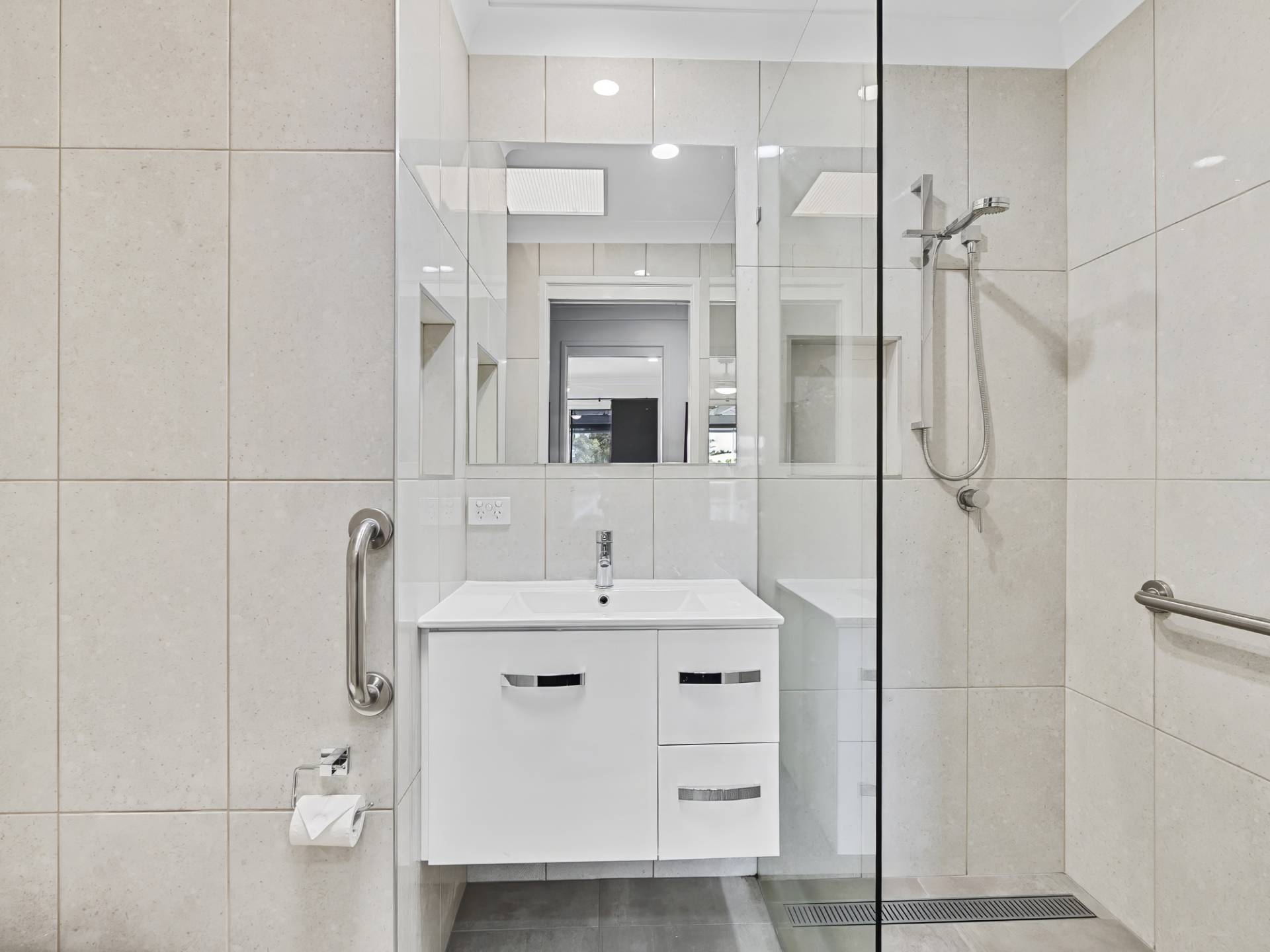 • Guest bathroom with large doorless shower and separate modern toilet room