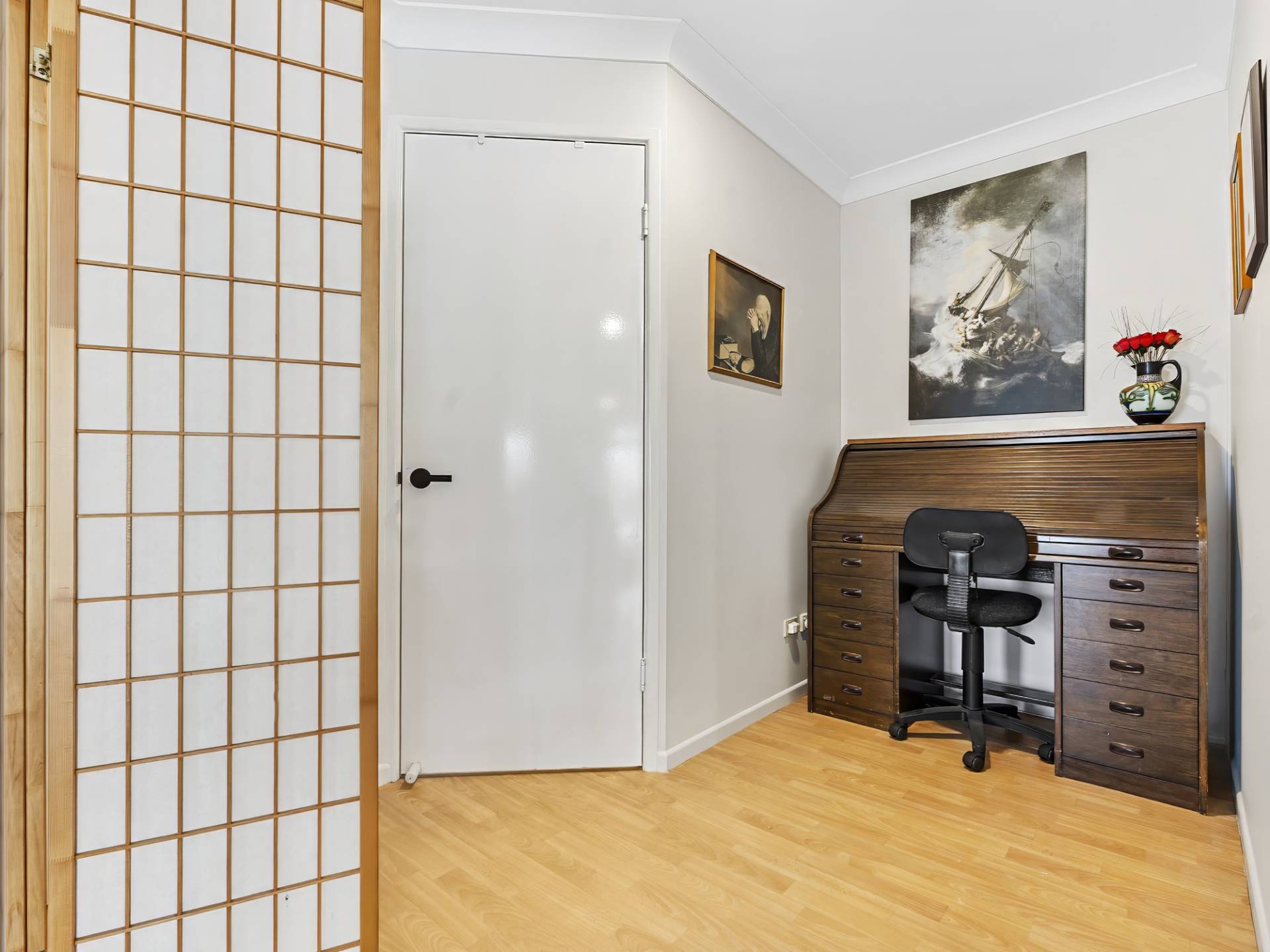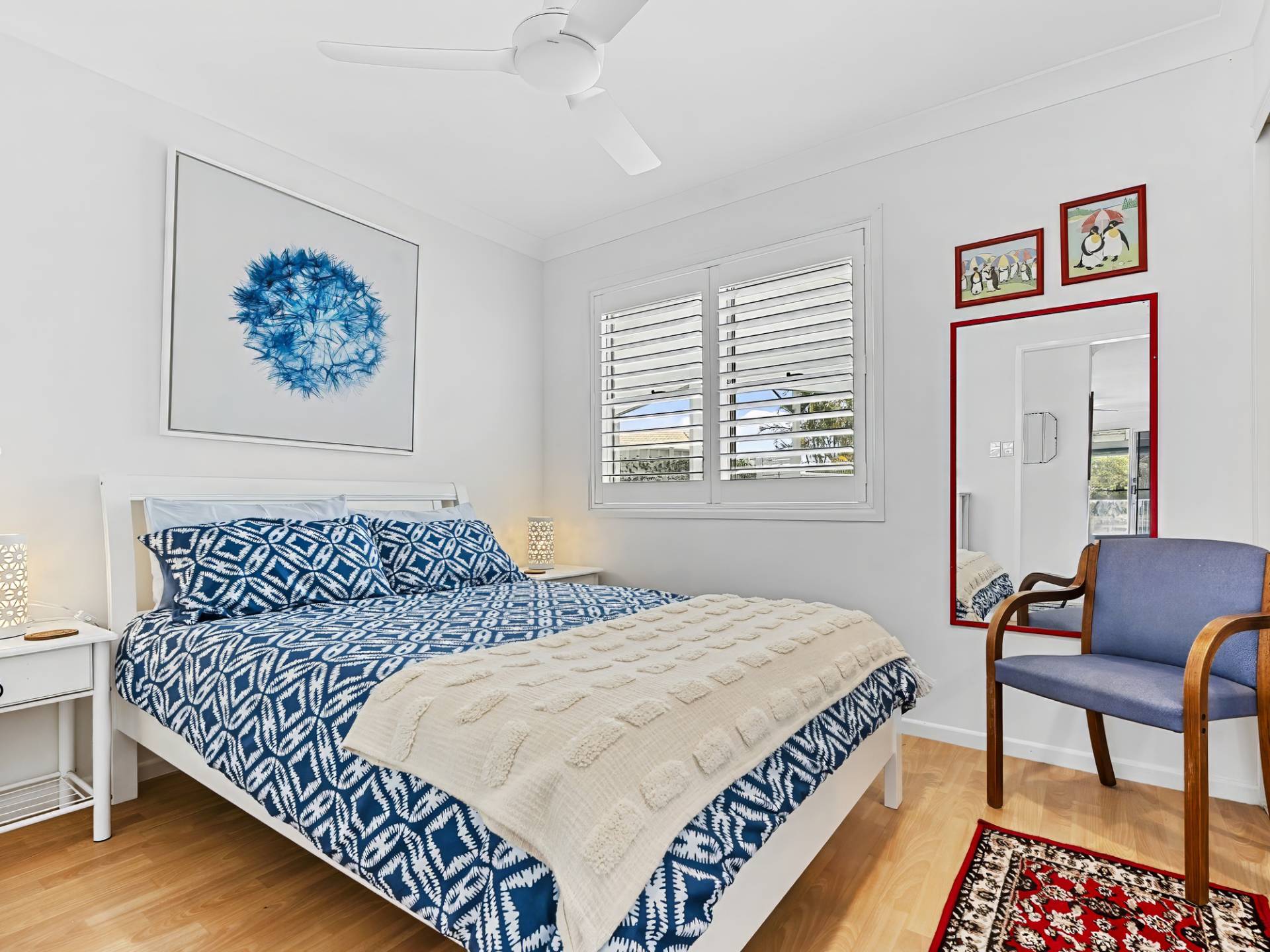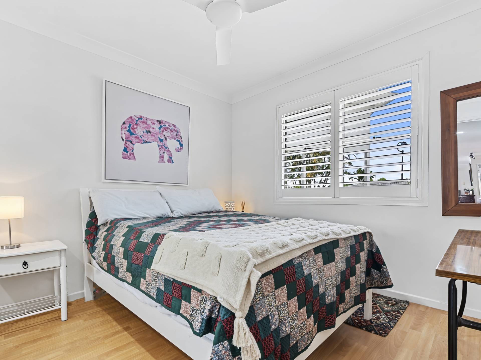 • Two other bedrooms with crisp white plantation shutters, modern ceiling fans and built-in mirror front robes