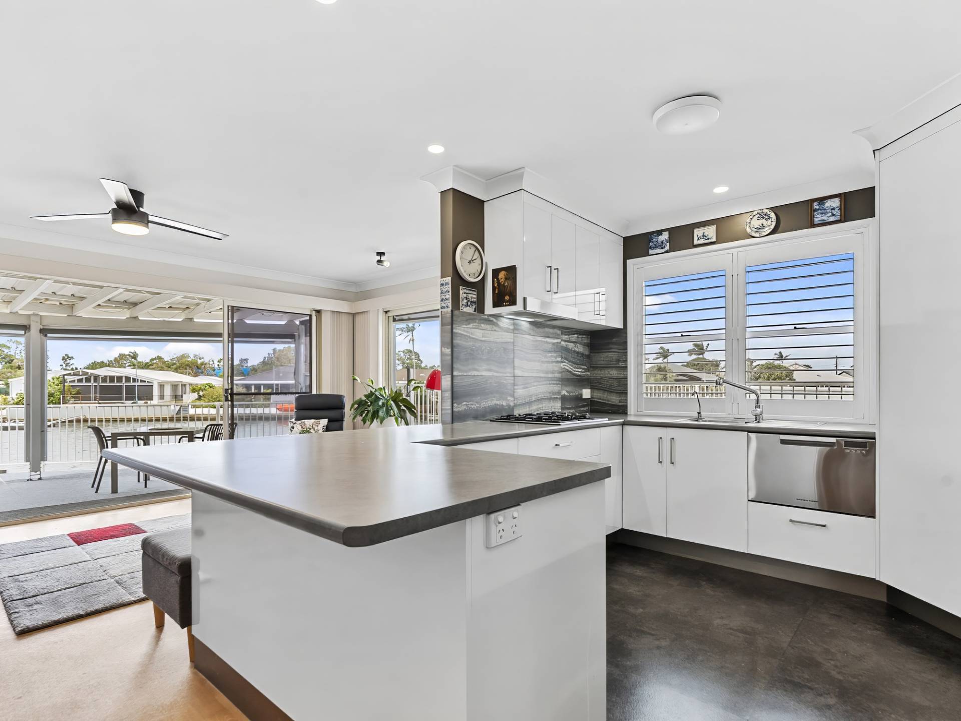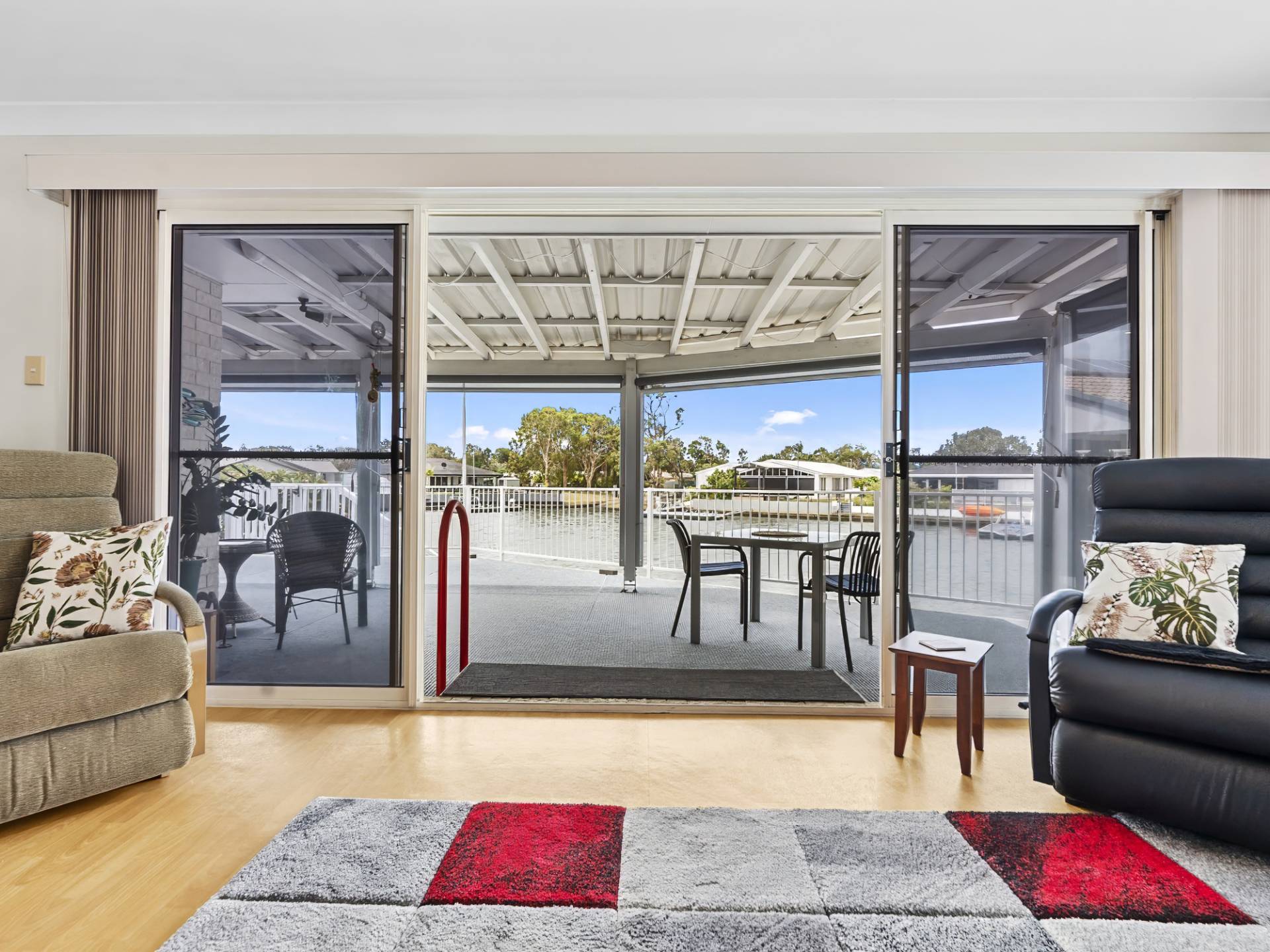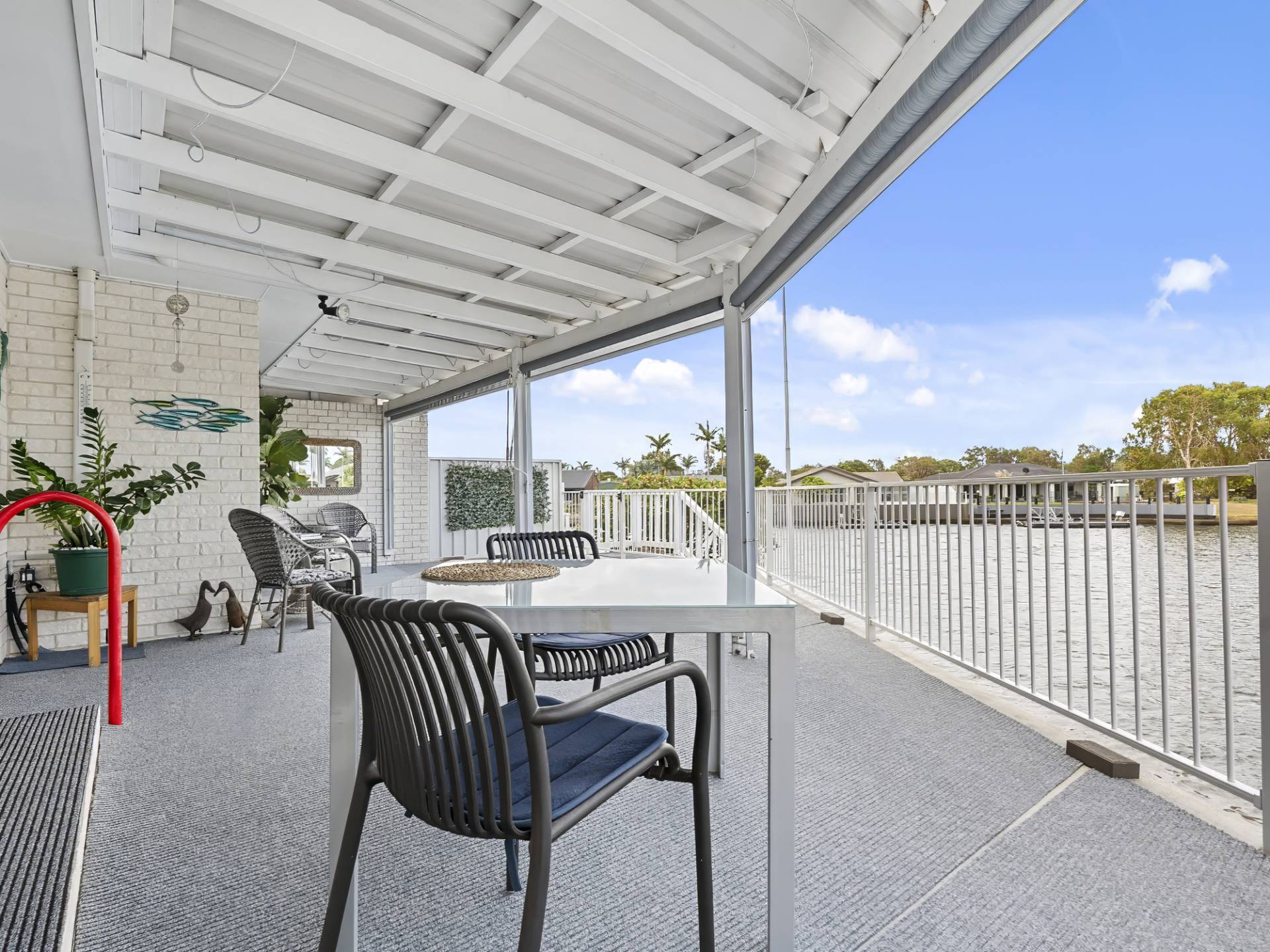 • Impressive north facing covered outdoor living area (on concrete slab) with marine grade carpet, all-weather blinds for privacy and staircase down to canal front level