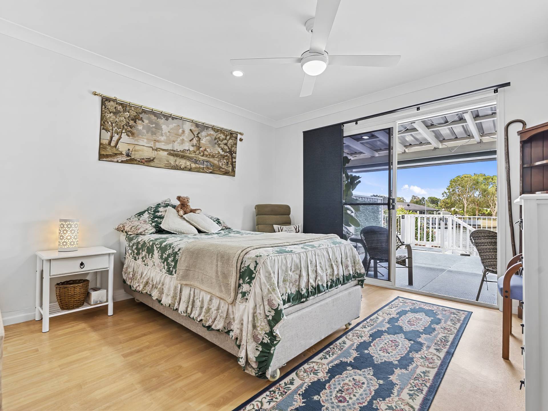 • Air-conditioned Master bedroom with views of canal via sliding doors, walk in robe and ensuite featuring a good-sized doorless shower, skylight, vanity and modern toilet