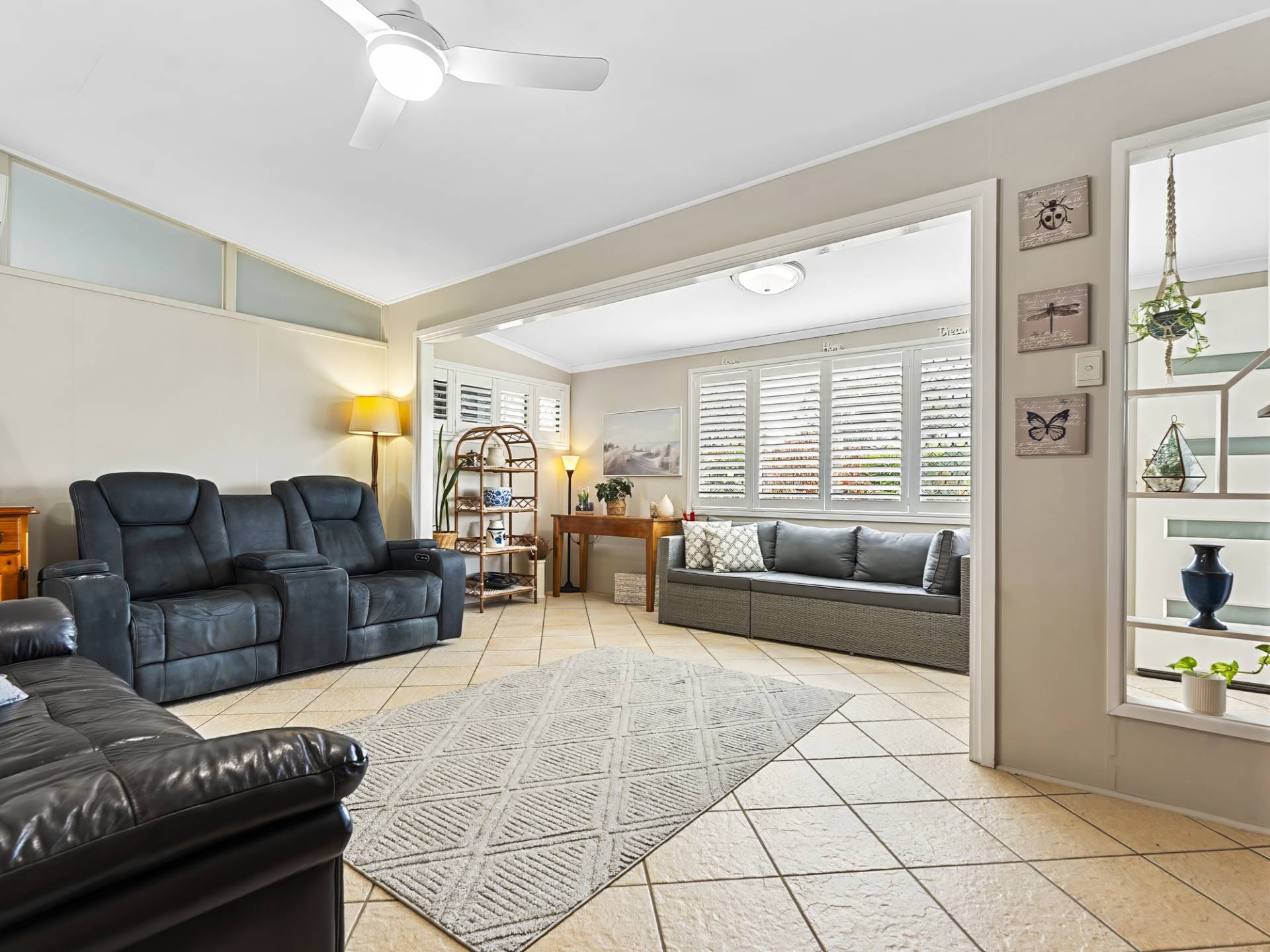 Generous sized living room with raked ceiling, air-conditioning ceiling fan and crisp white Plantation Shutters