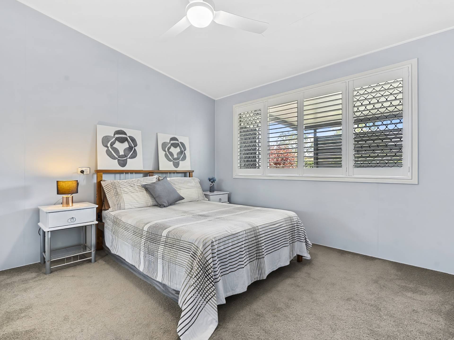 Master bedroom with raked ceiling, full length BIR, Air-conditioning, Ceiling Fan and Plantation Shutters