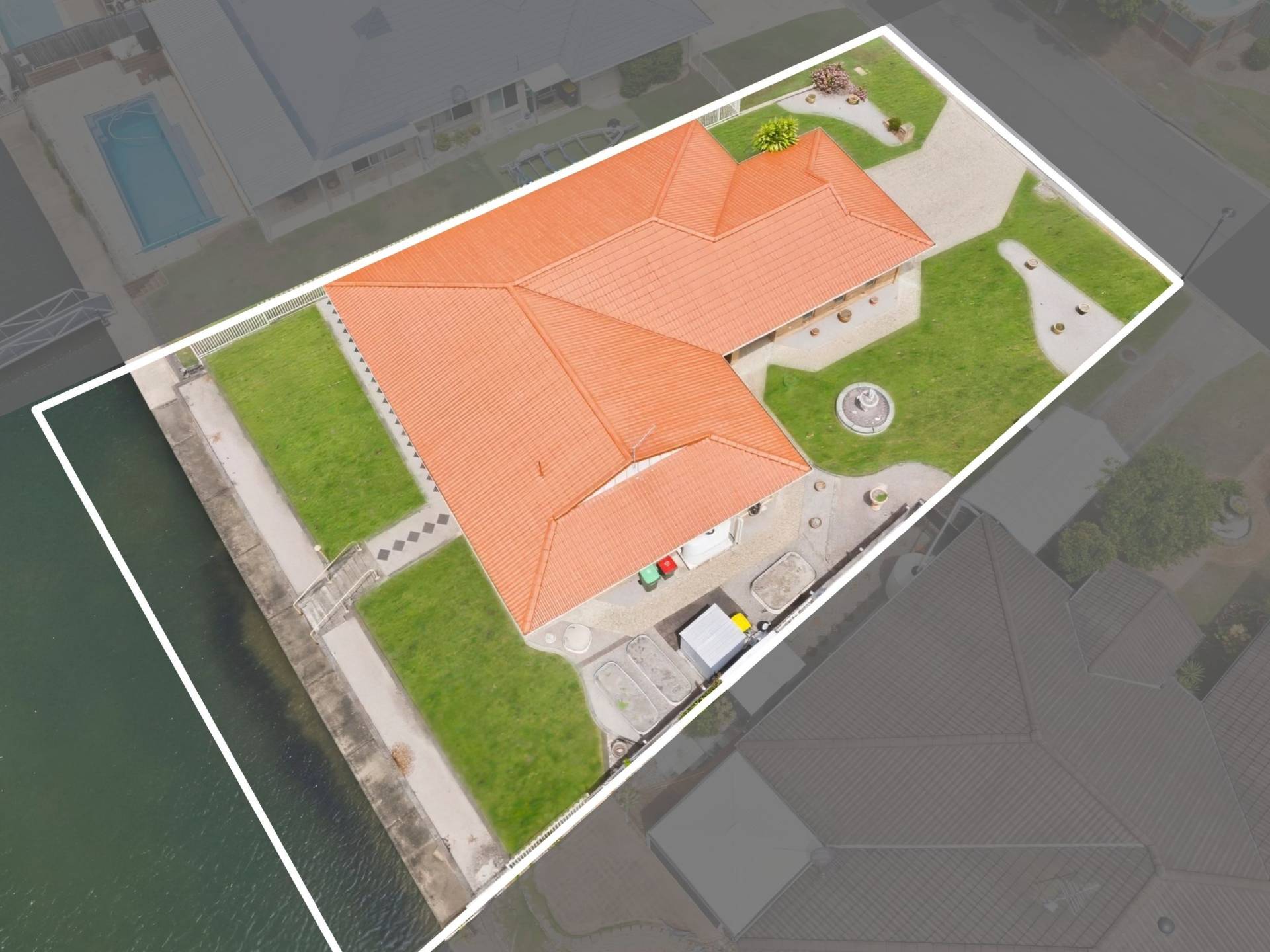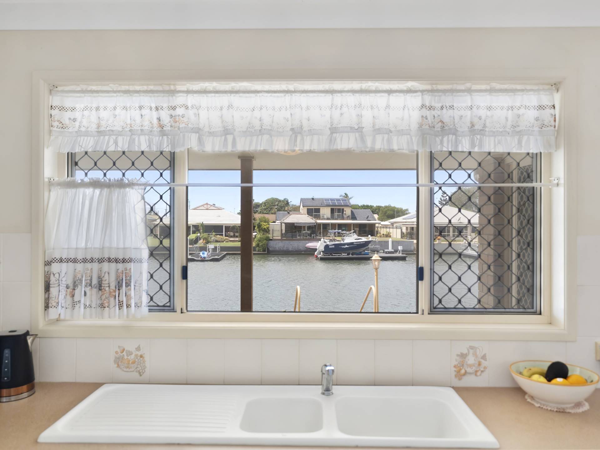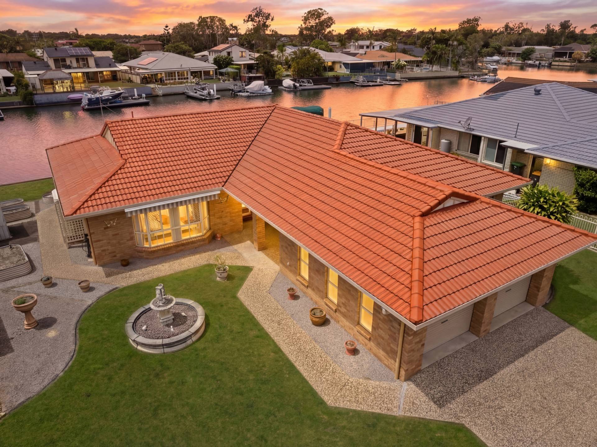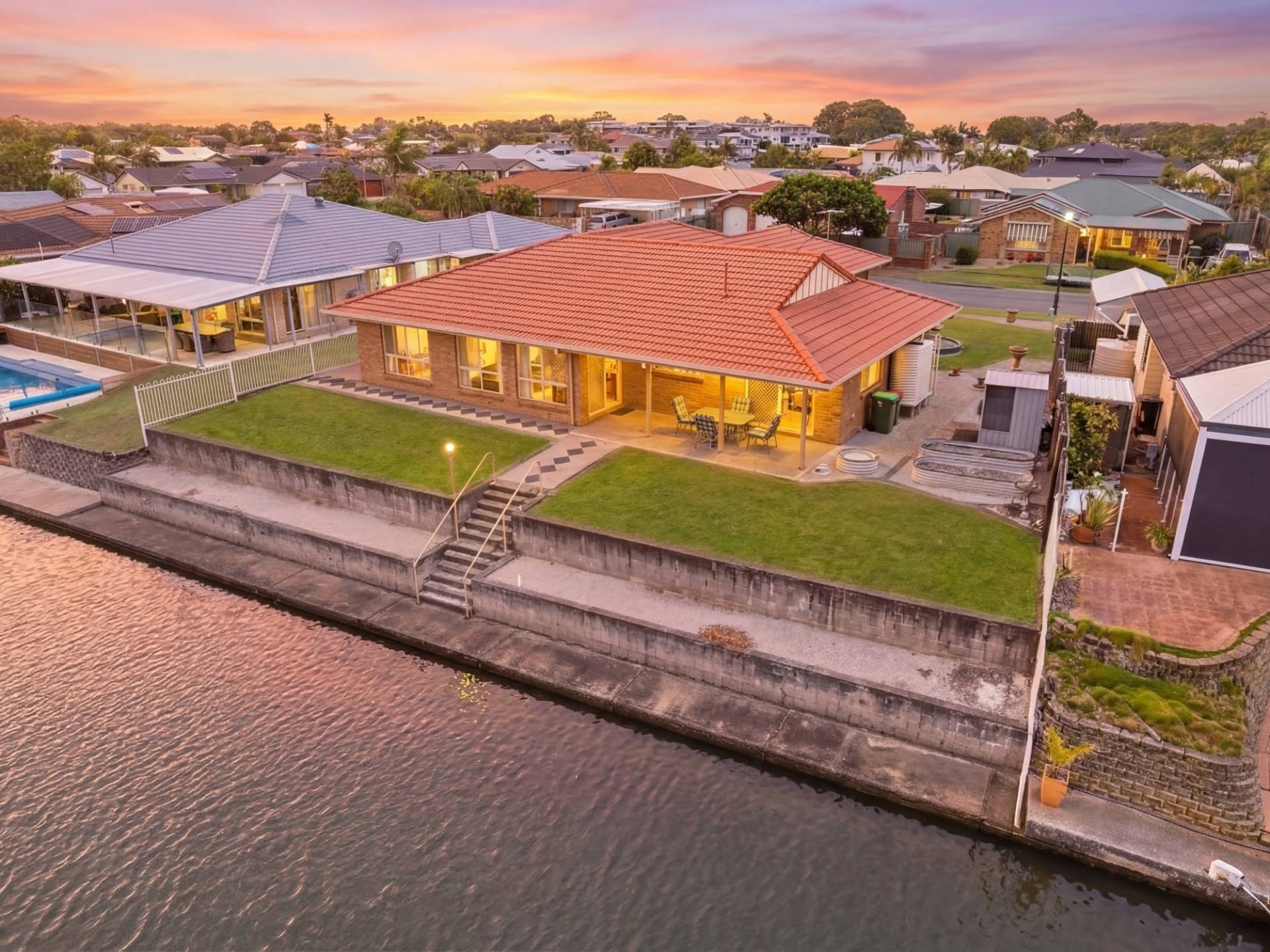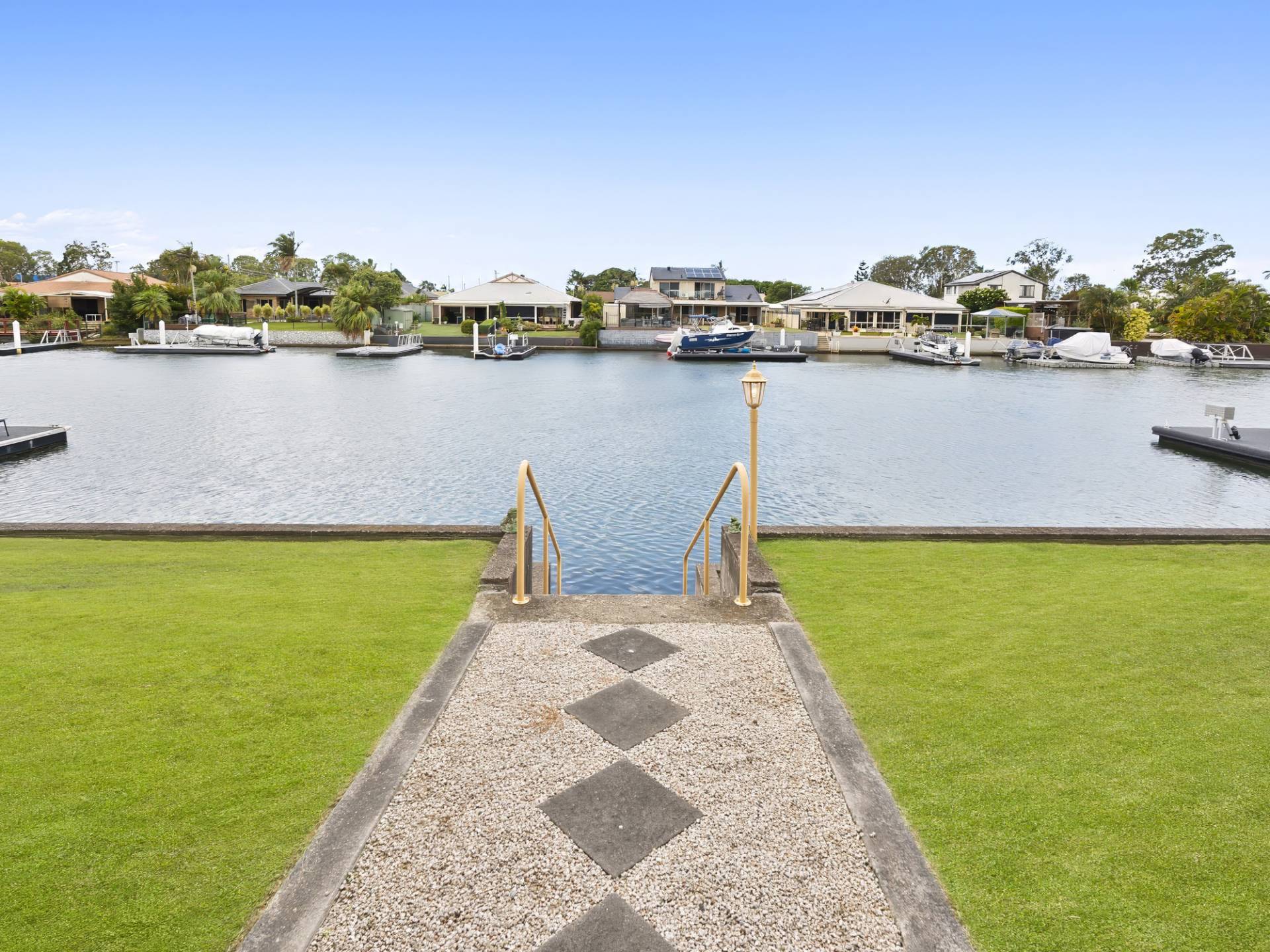 The outdoor covered entertaining area is perfectly positioned to take in full canal views.