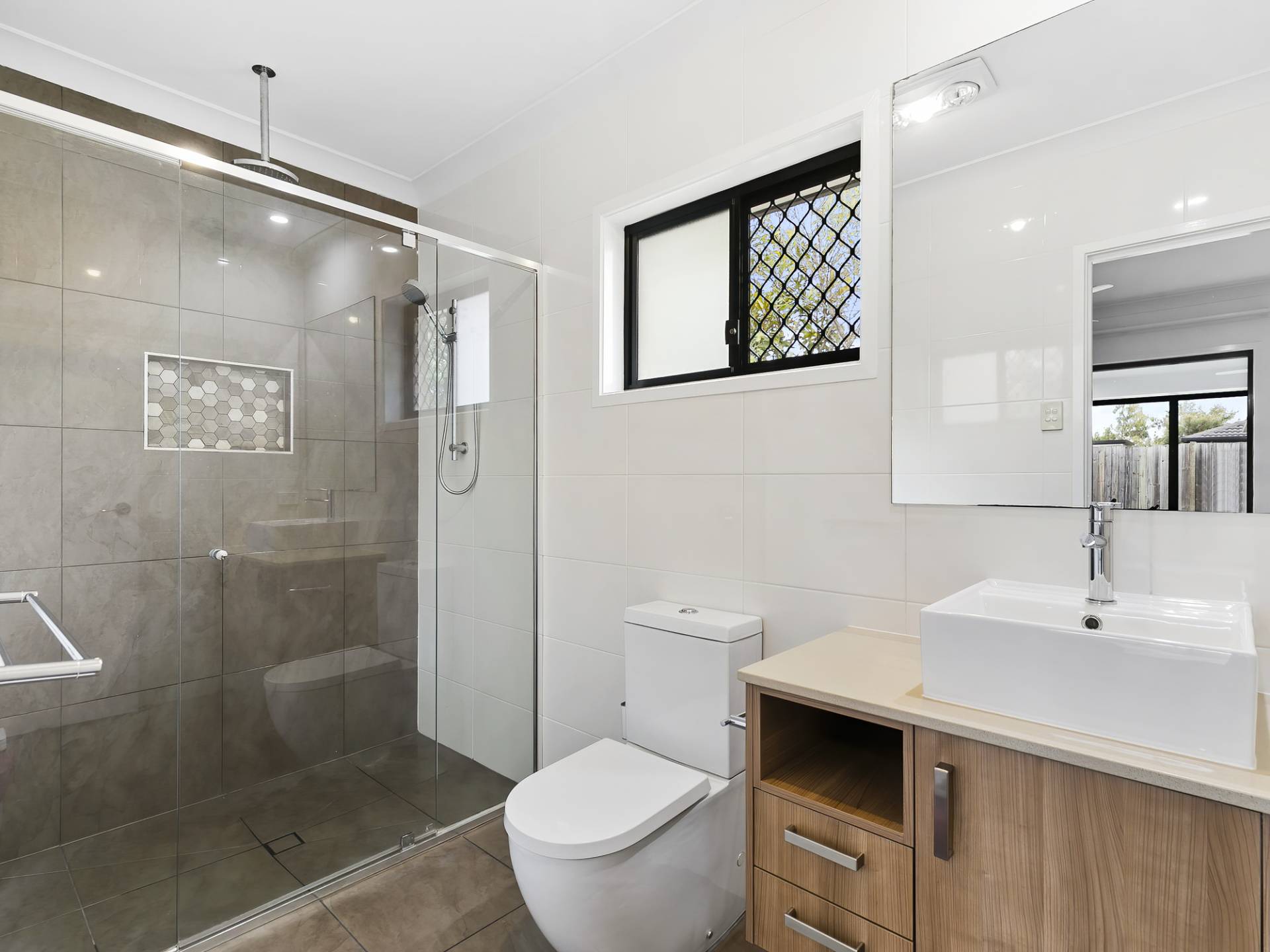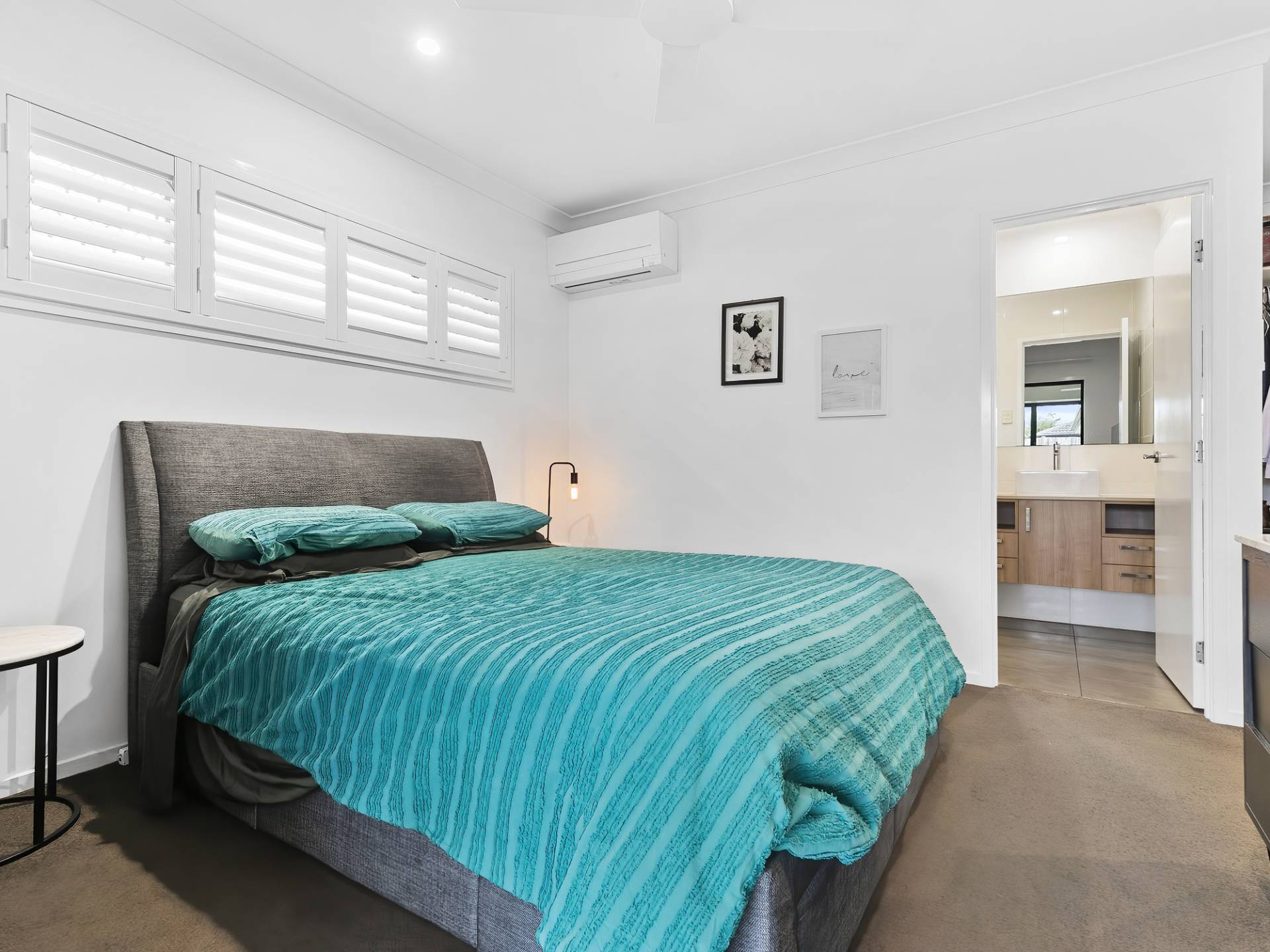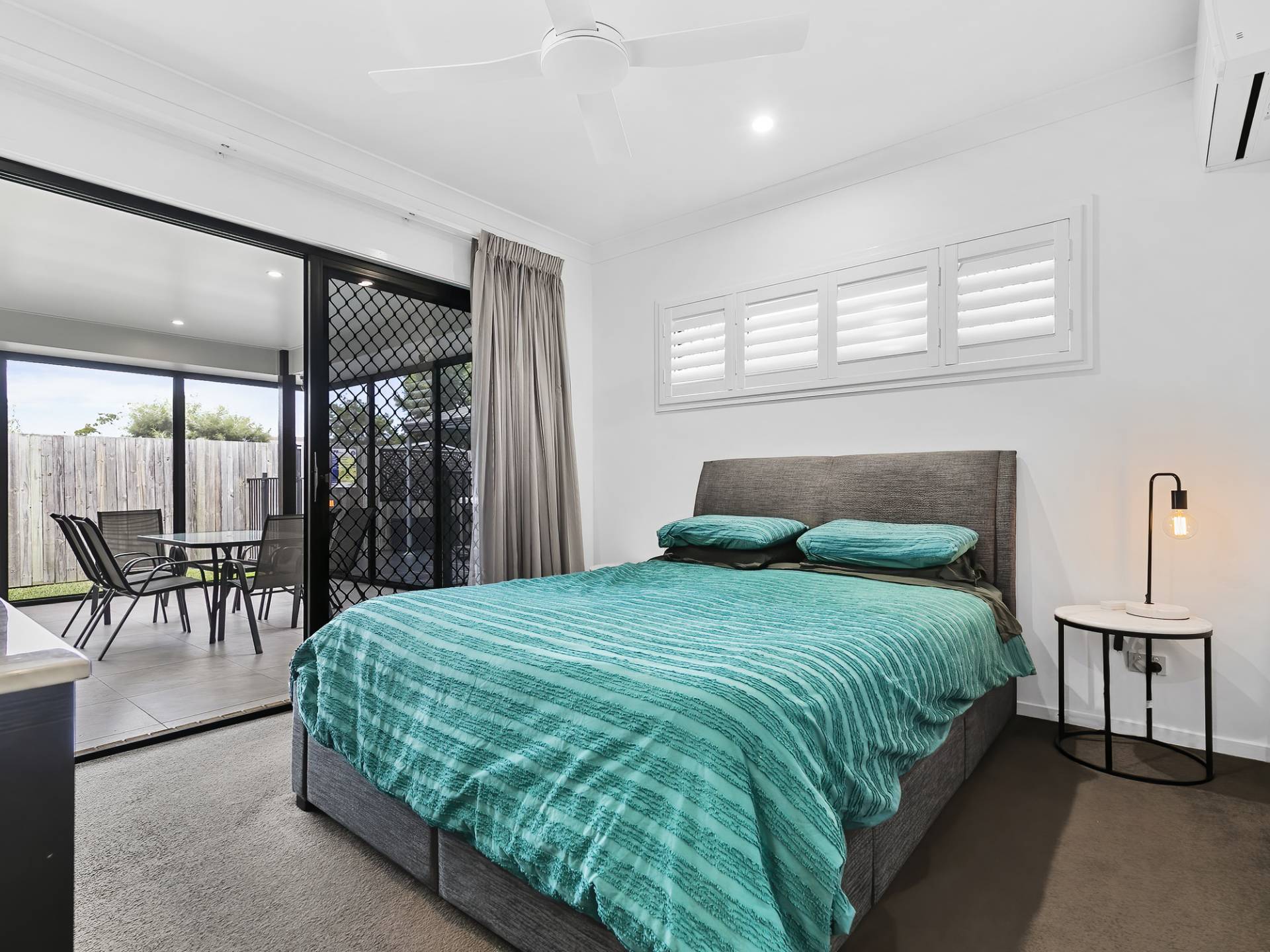 The air-conditioned master suite has a large sliding door opening to the fully enclosed outdoor entertaining area, ceiling fan, walk-in-robe and ensuite, featuring a long shower with rain showerhead and hand-held unit, heat lamps, modern toilet and vanity.