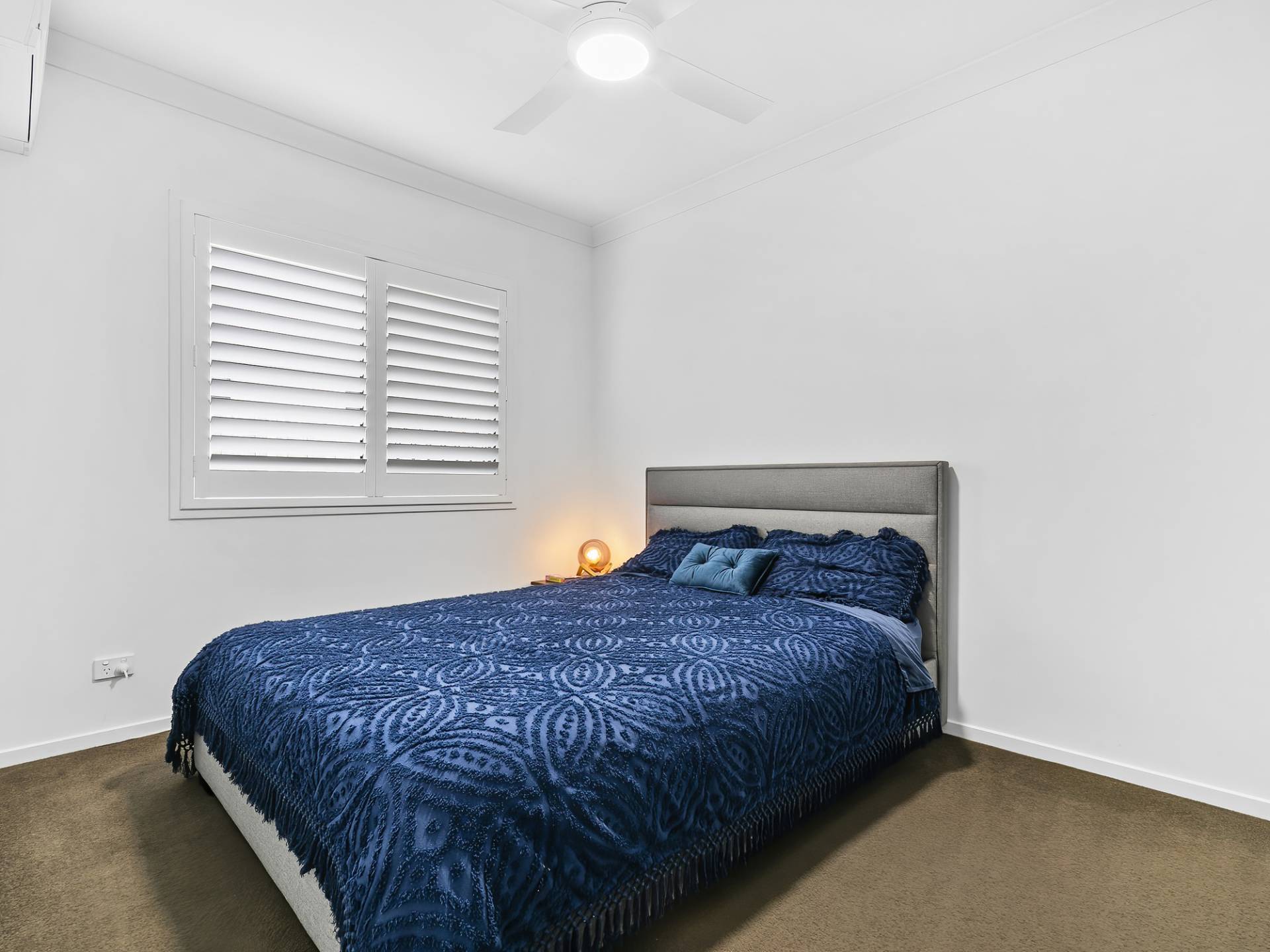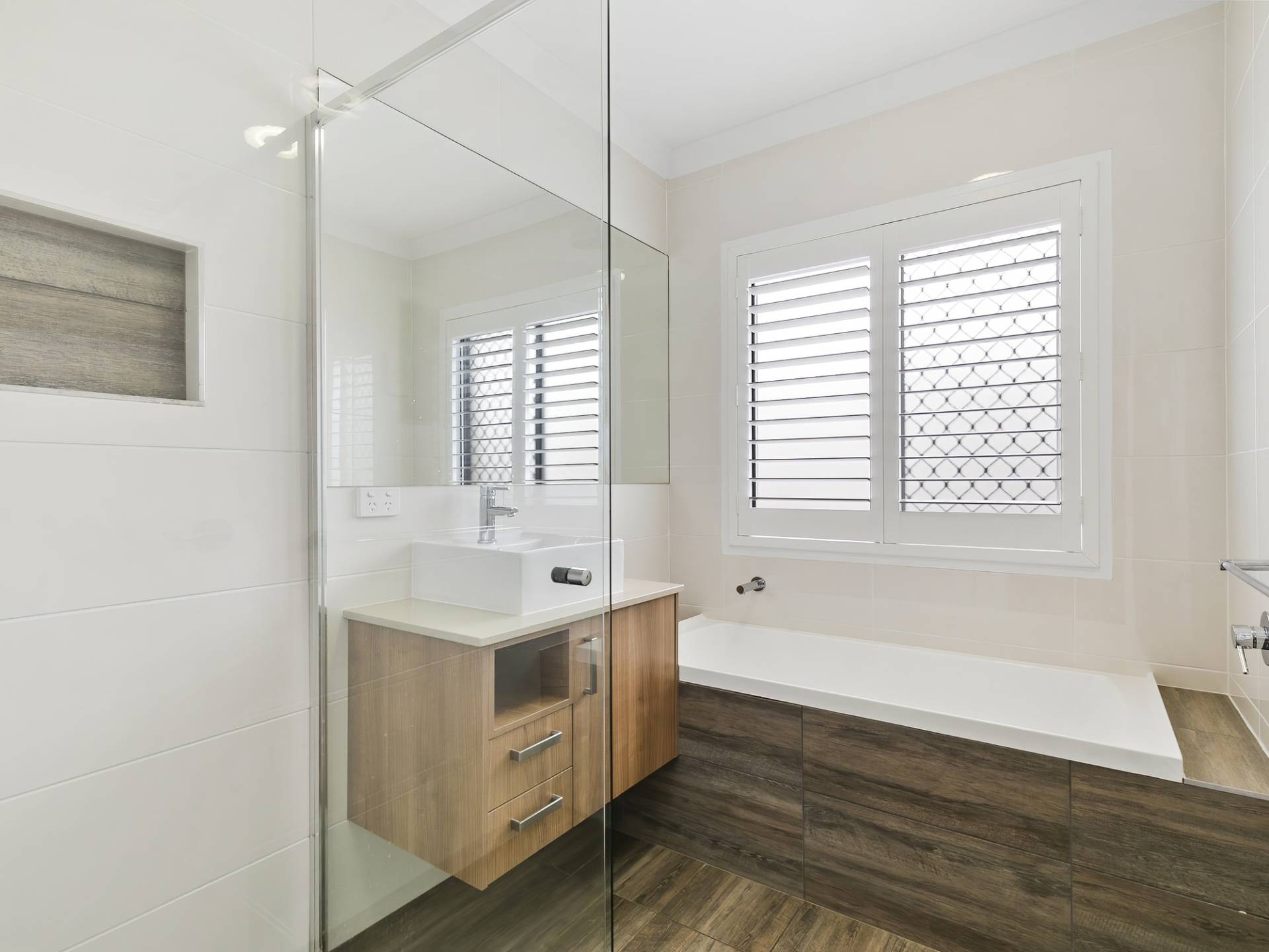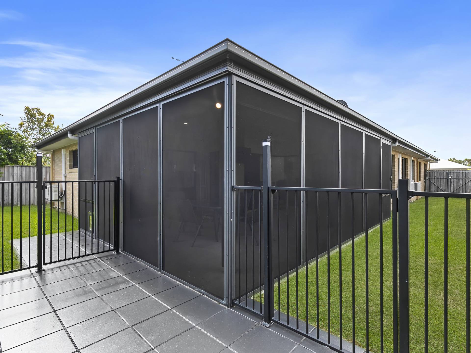 The air-conditioned master suite has a large sliding door opening to the fully enclosed outdoor entertaining area, ceiling fan, walk-in-robe and ensuite, featuring a long shower with rain showerhead and hand-held unit, heat lamps, modern toilet and vanity.