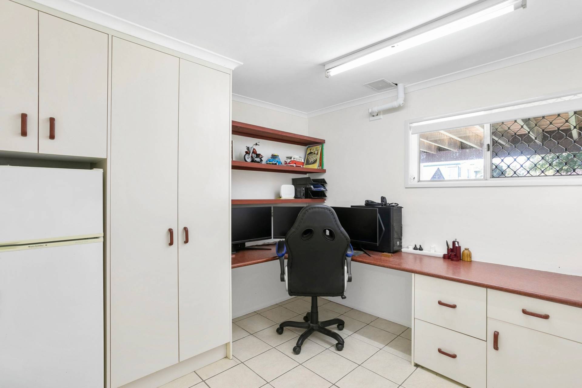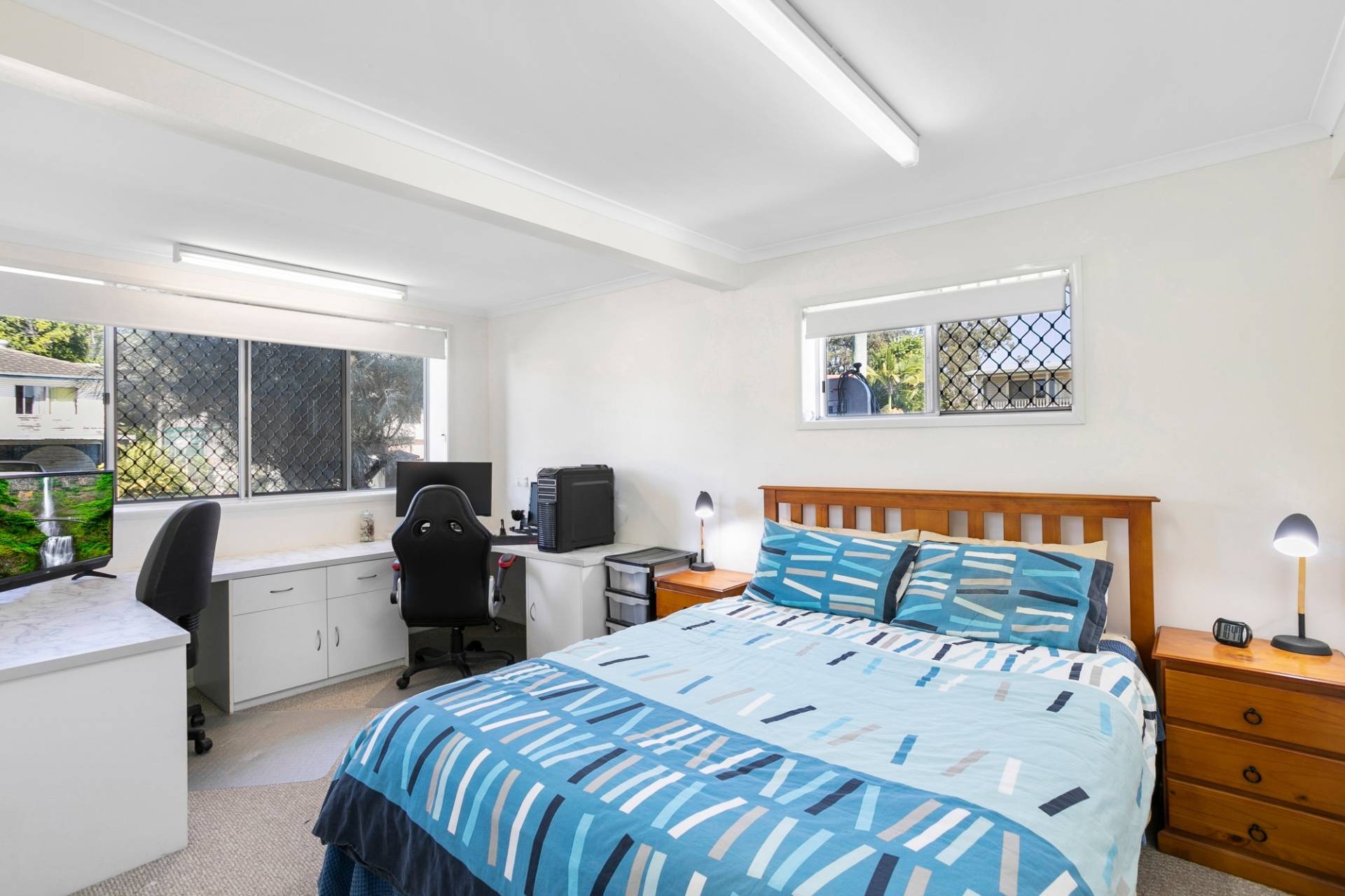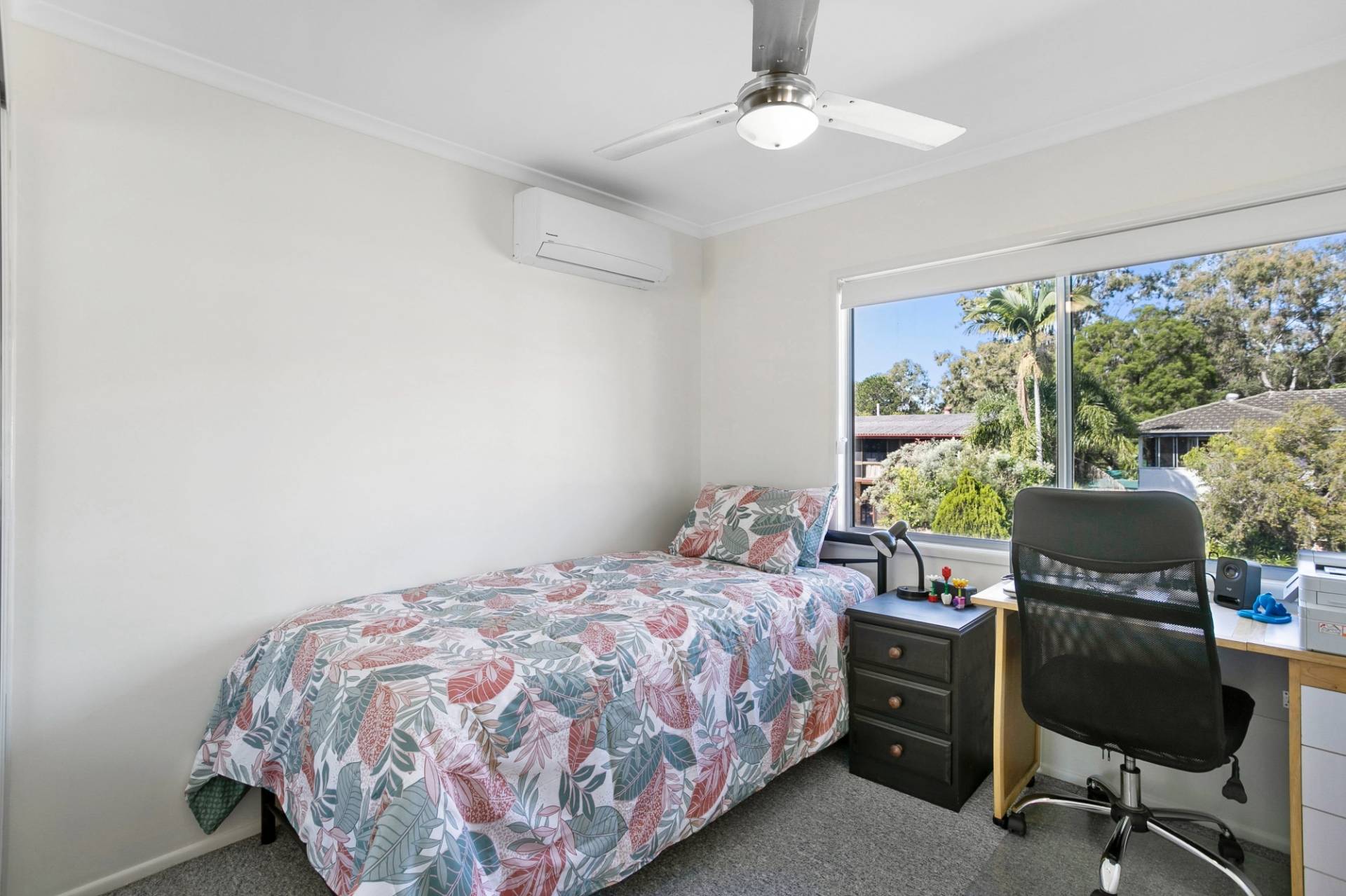 Downstairs, as you enter via the entrance hall, you’ll find a second air-conditioned living area, currently used as a media room, a good sized home office, a large walk-in storage room and a great sized bedroom ready for the teenager to enjoy.