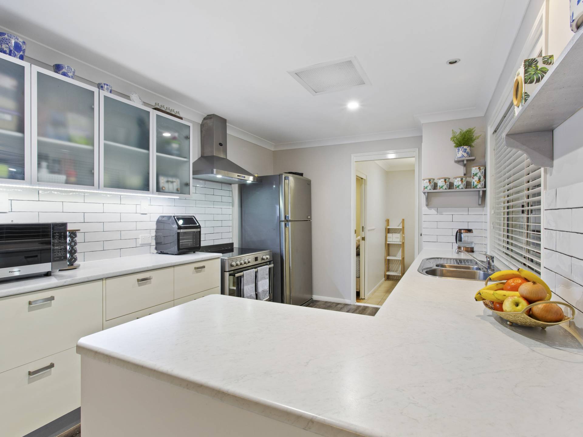 • Large kitchen with freestanding 900mm stainless steel cooker and range hood, dishwasher, feature lighting + skylight and loads of storage
