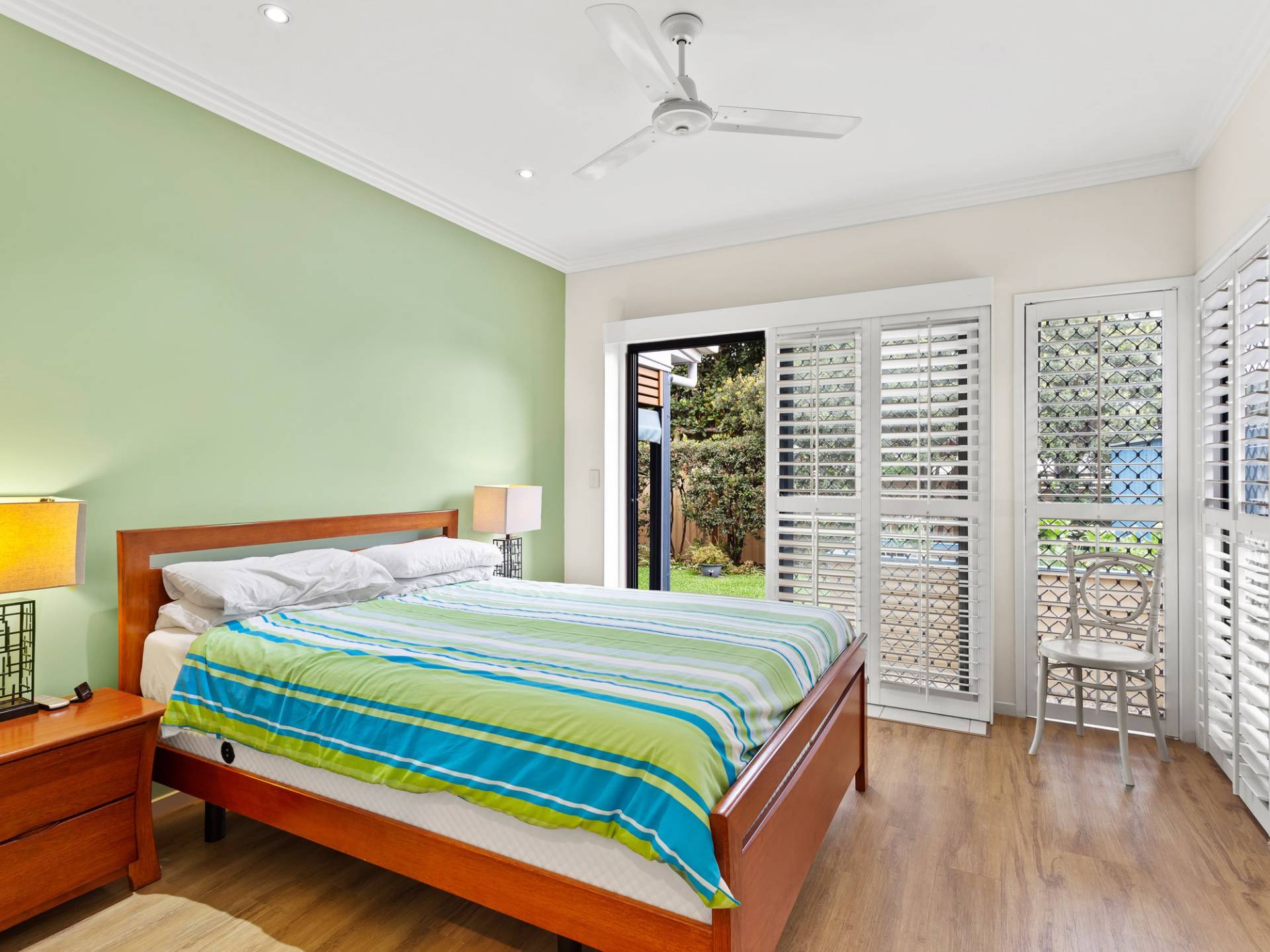 •          Master bedroom with ensuite and sliding doors to outdoors, furnished with crisp white plantation shutters