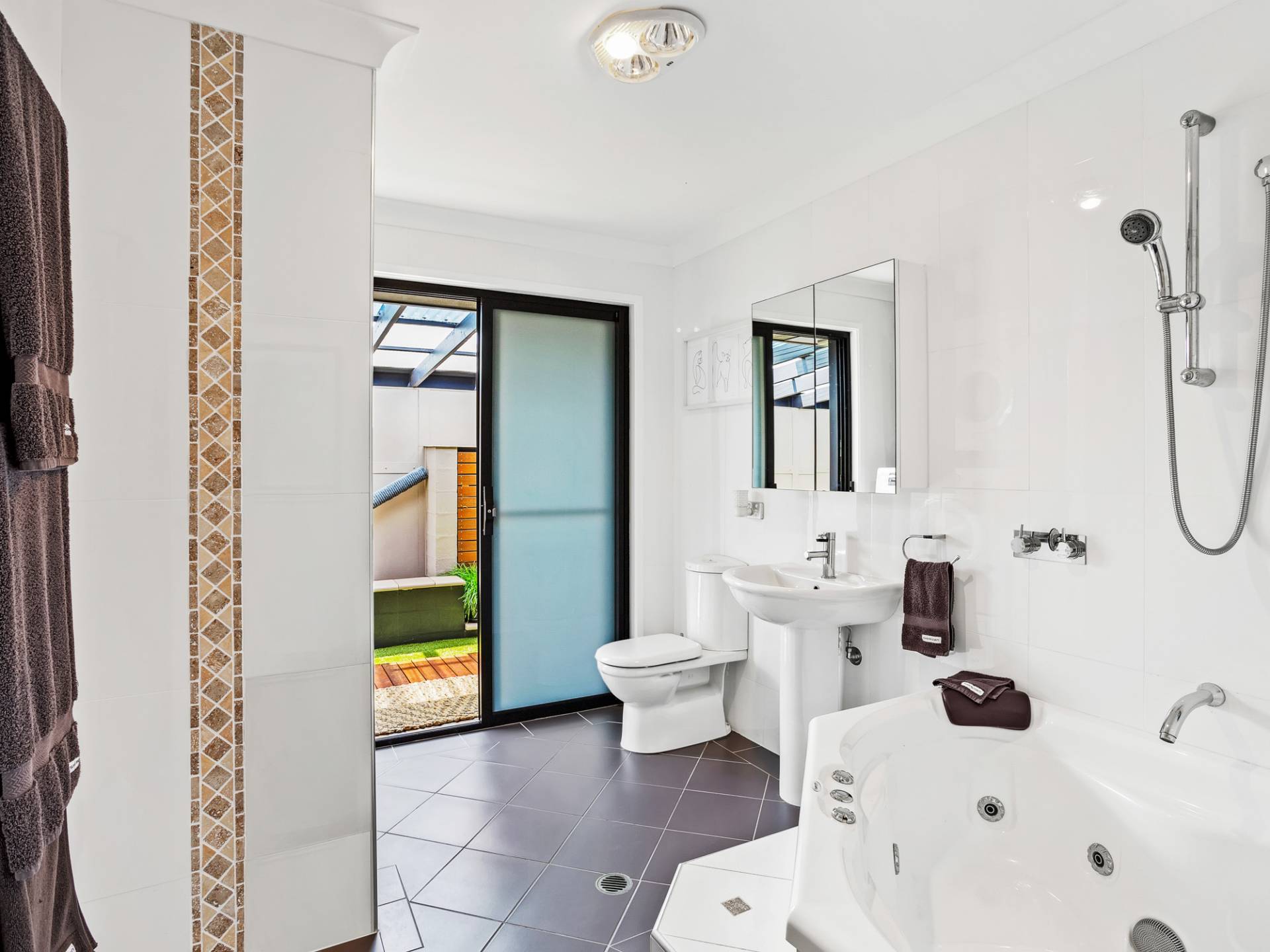 A good-sized main bathroom is located on the lower level with a spa bath to ease into at the end the day for total relaxation, floor to ceiling tiles, freestanding basin and modern toilet.