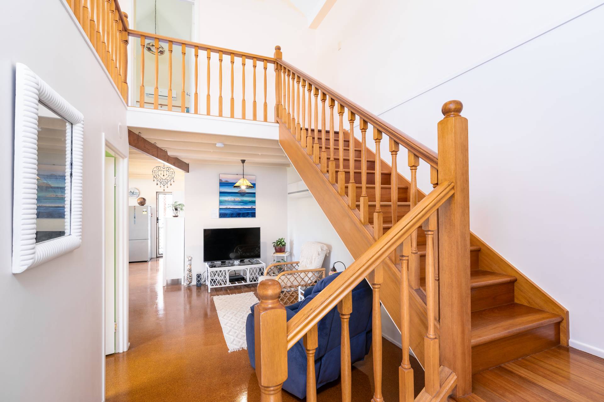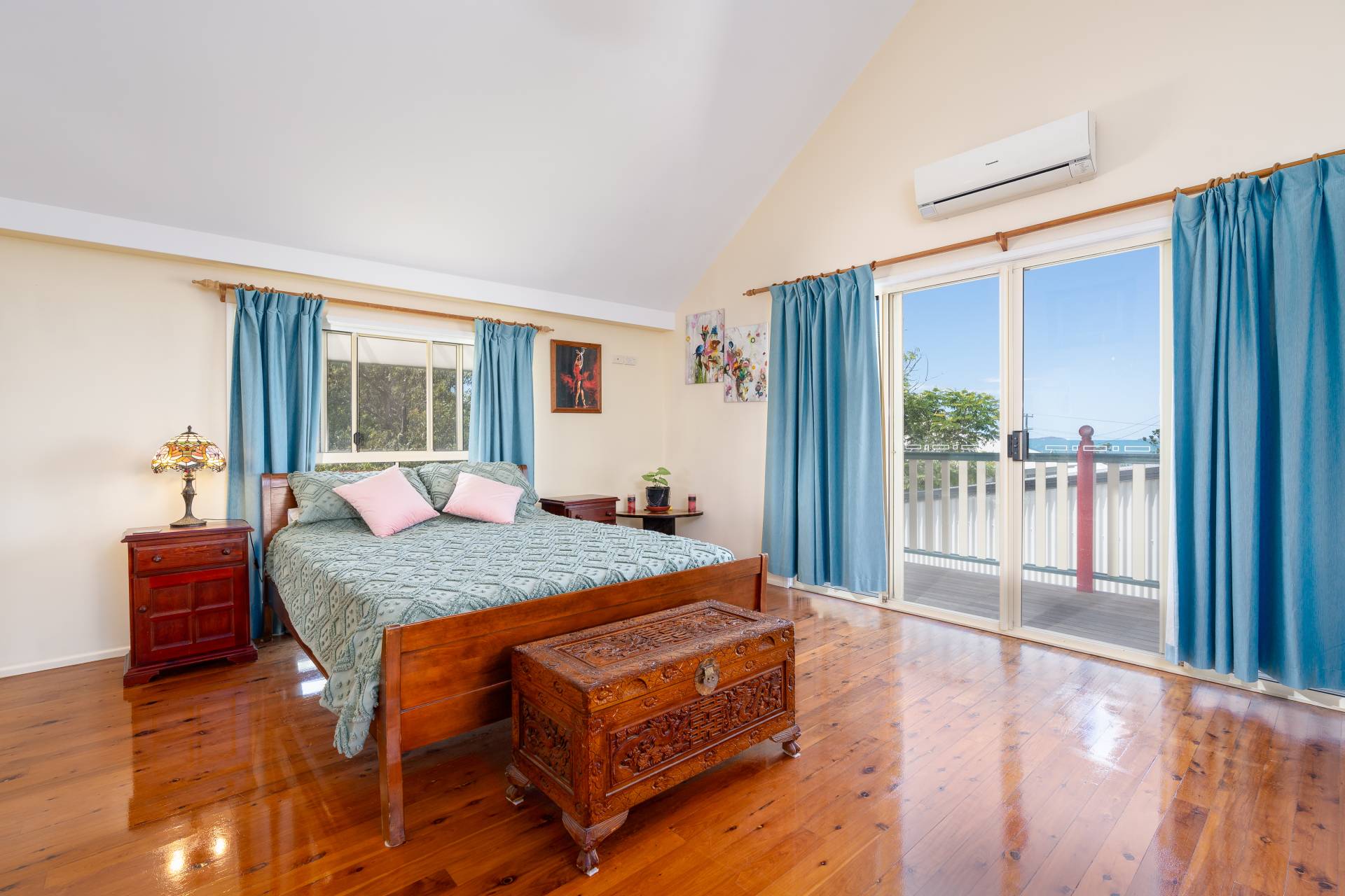 Head up the polished timber staircase to the upper level where you will find the mezzanine and a huge air-conditioned master bedroom (7m x 5m) with built in robes.  Here you will marvel at the spectacular views across to Great Keppel Island and the Capricorn Coastline and bask in sunrises each and every day.  Polished floorboards and a conveniently located upstairs powder room with toilet complete the top-level living space.