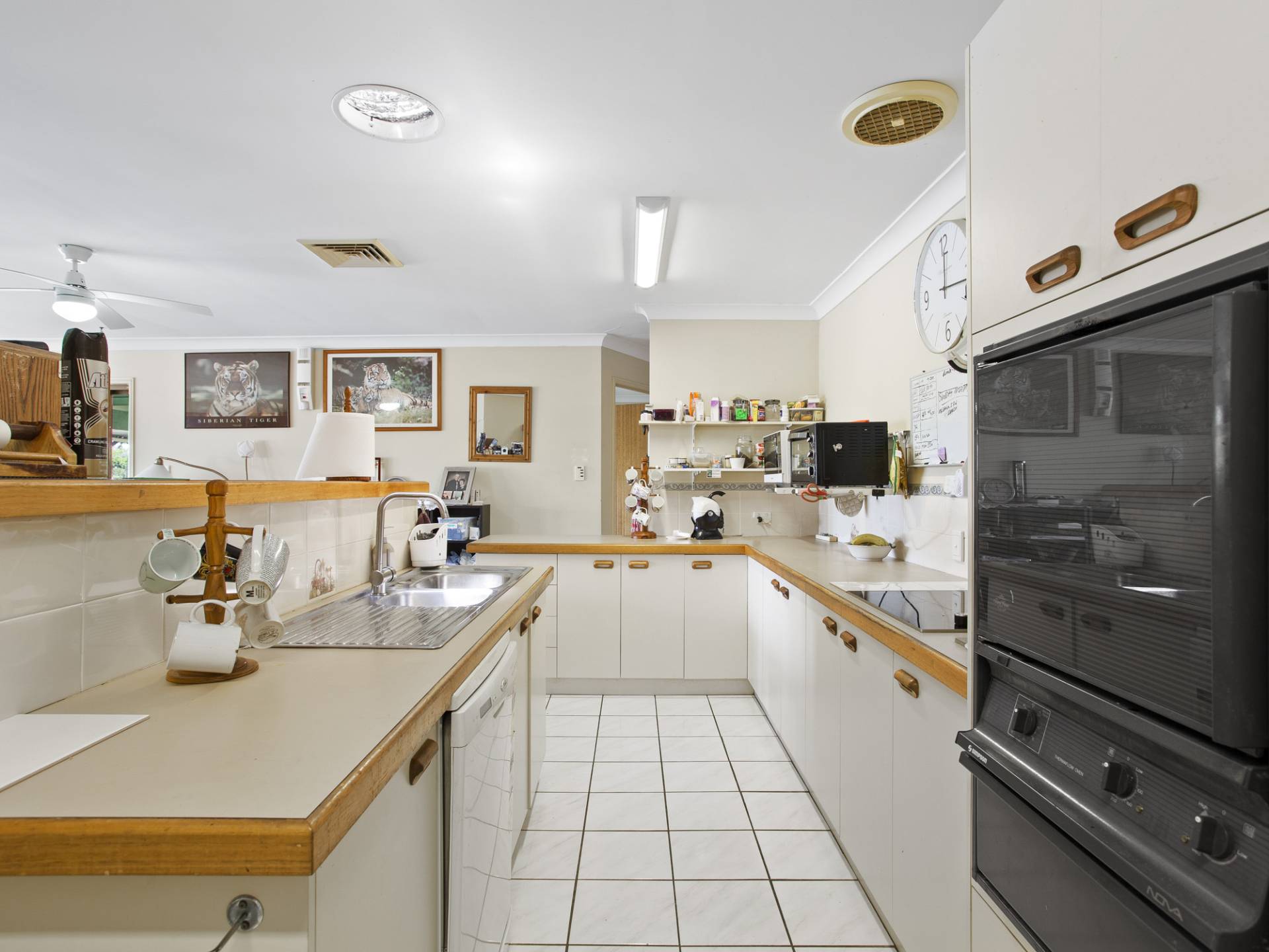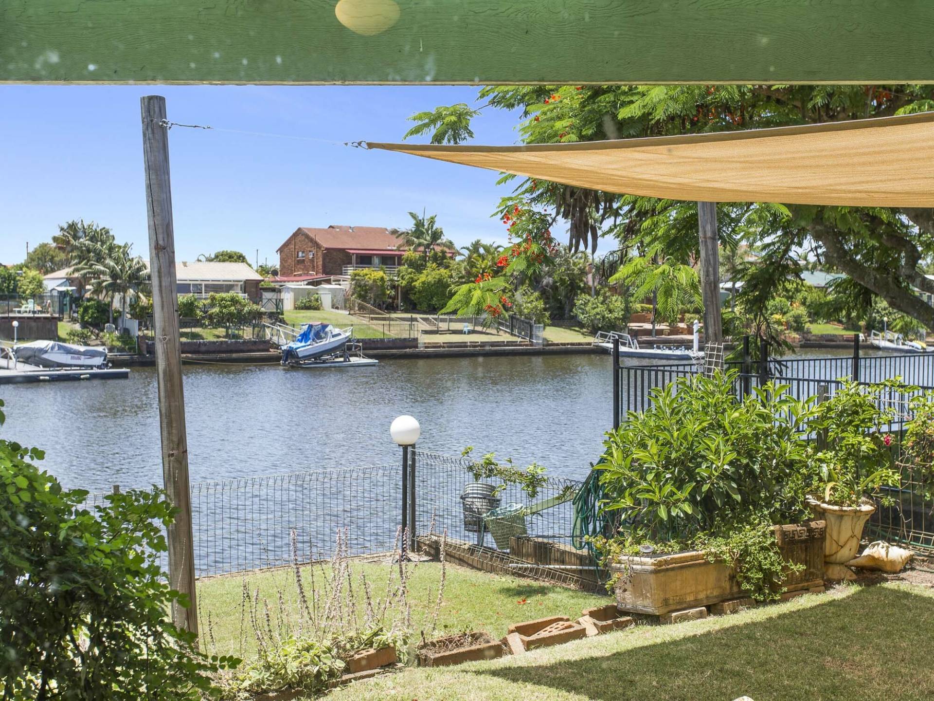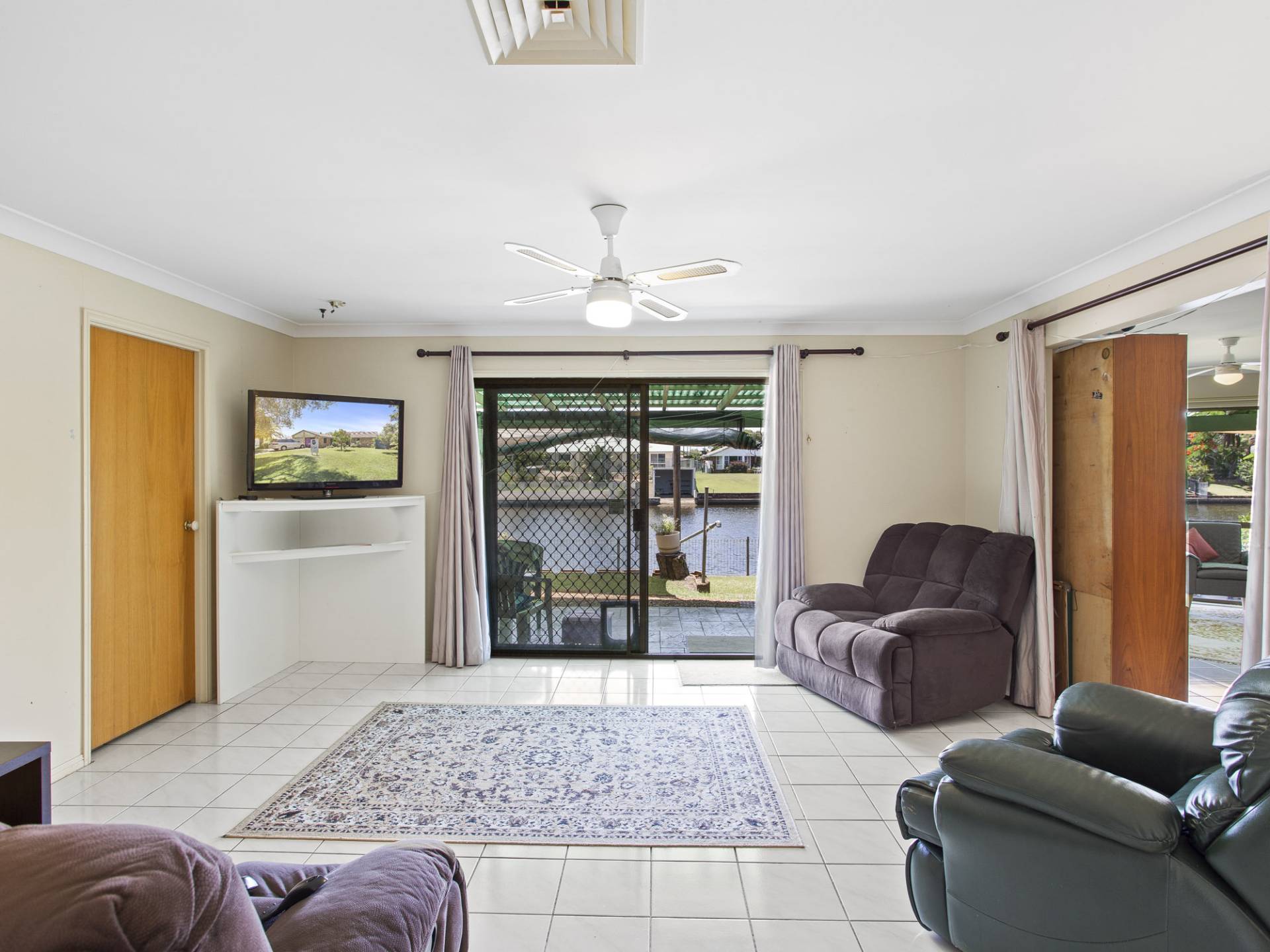 The interior layout maximises living spaces with north-facing water views.  Three good-sized living spaces overlook the canal – formal lounge, family room and separate media room. Servicing the living areas, the kitchen also takes in the views and sits ready for a stylish update to your liking.